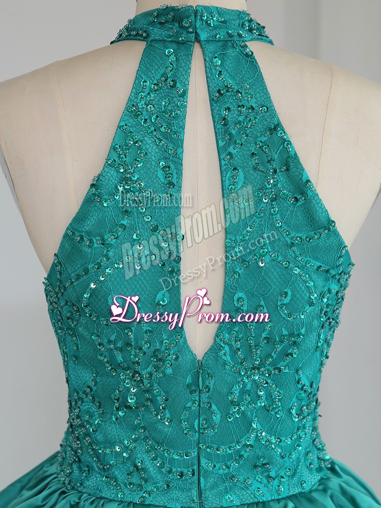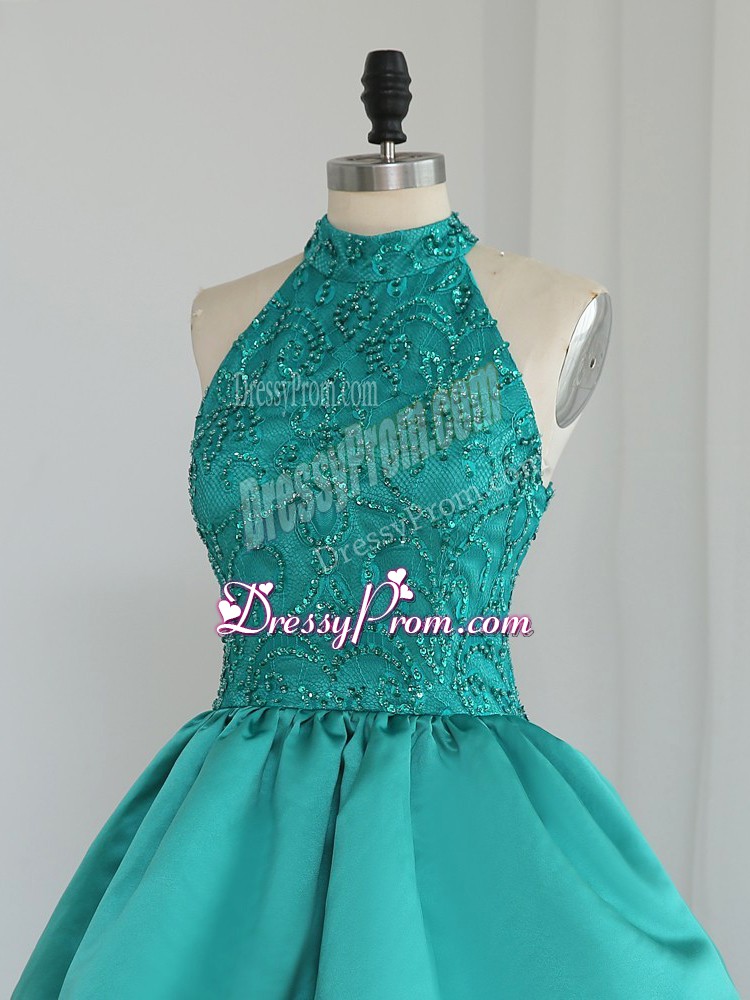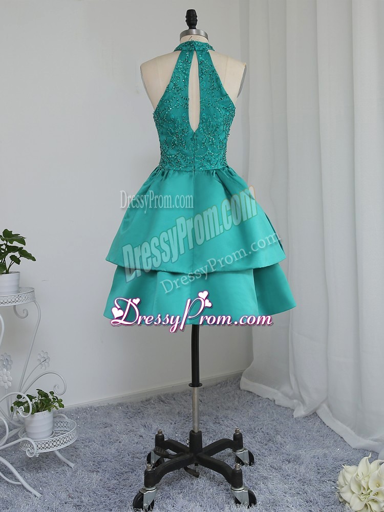 Neckline : High-neckShown Color : TurquoiseSilhouette : A-lineSleeve Length : sleevelessHemline : mini lengthBack Detail : ZipperFabric : SatinEmbellishment : Lace,AppliquesOccasion : Prom,Party,Sweet 16Season : Spring,Summer,Fall