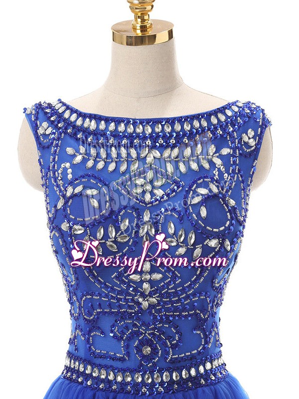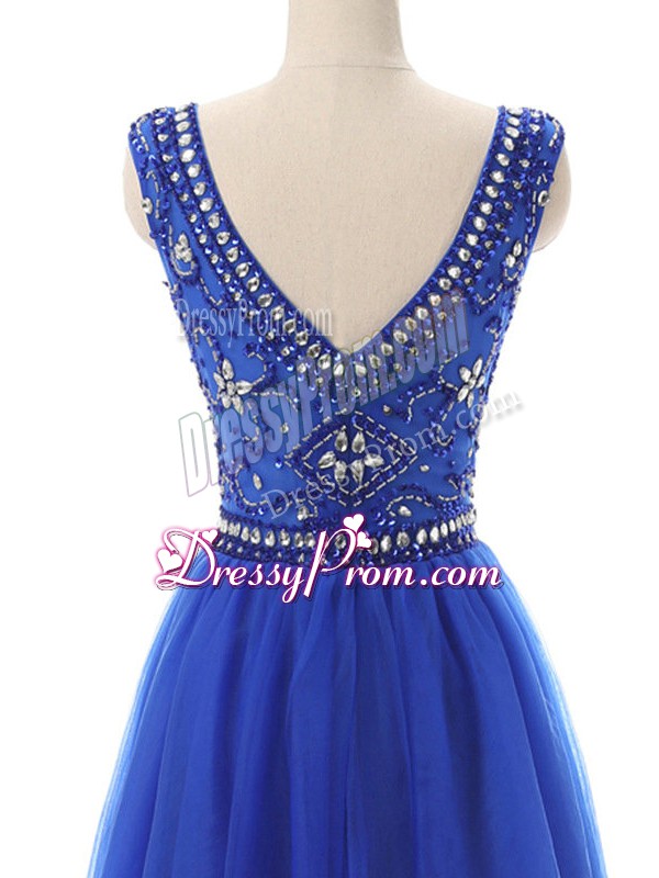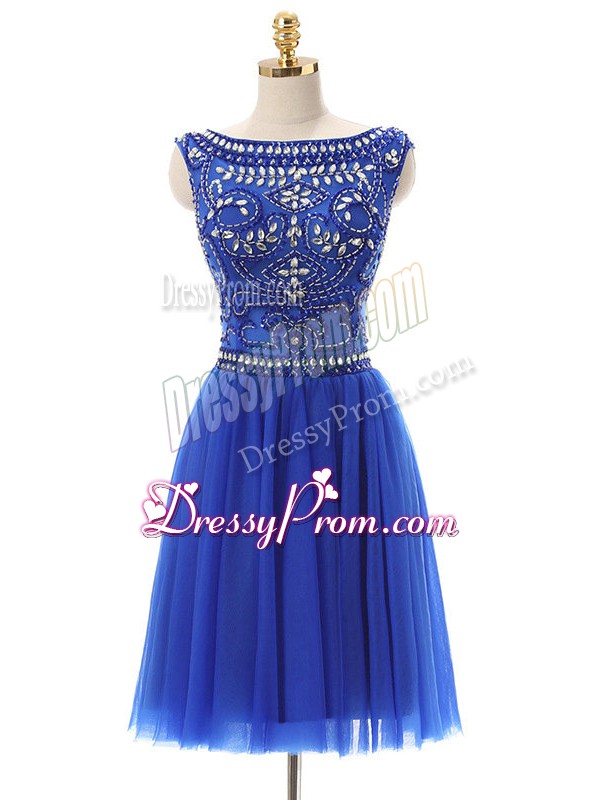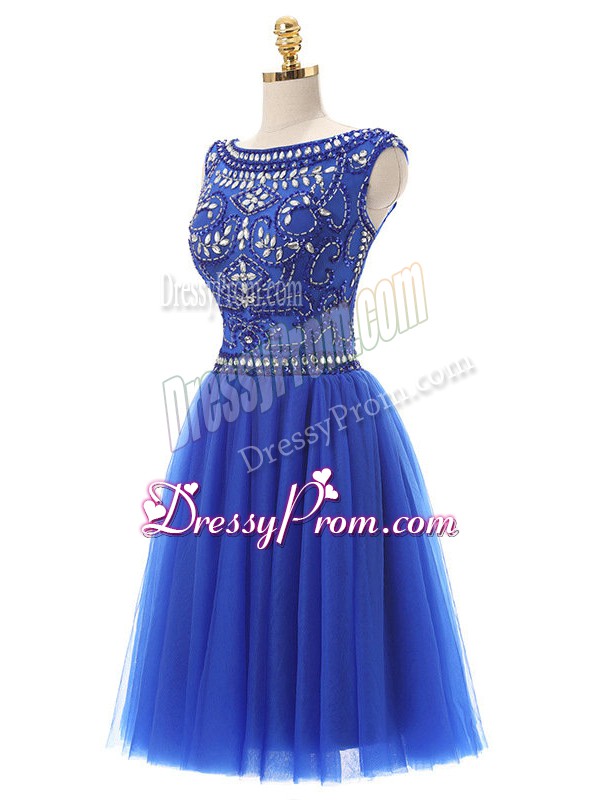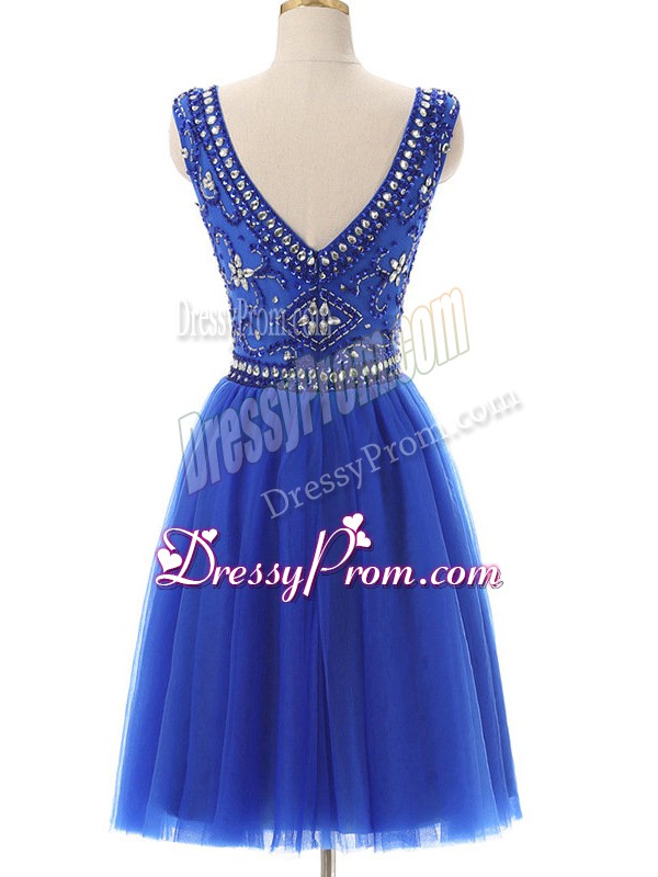 Neckline : ScoopShown Color : Royal BlueSilhouette : EmpireSleeve Length : sleevelessHemline : knee lengthBack Detail : ZipperFabric : TulleEmbellishment : BeadingOccasion : Prom,Party,Sweet 16Season : Spring,Summer,Fall