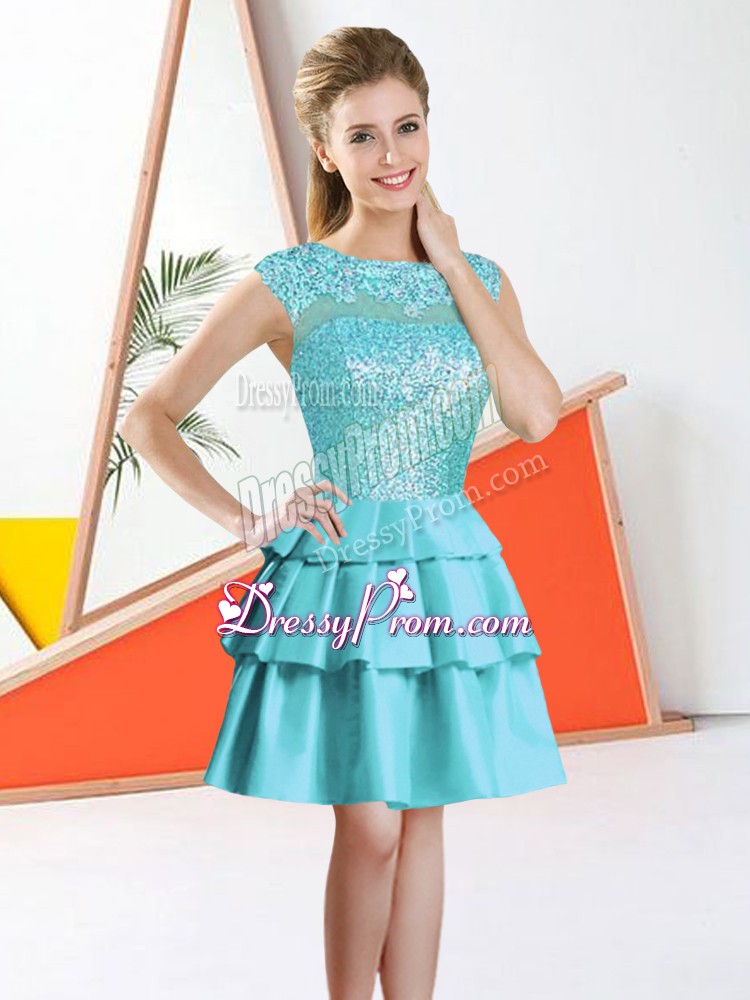 Neckline : BateauShown Color : Aqua BlueSilhouette : A-lineSleeve Length : sleevelessHemline : knee lengthBack Detail : BacklessFabric : TaffetaEmbellishment : Beading,LaceOccasion : Prom,PartySeason : Spring,Summer,Fall