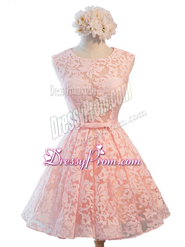 Neckline : ScoopShown Color : Pink Silhouette : A-lineSleeve Length : sleevelessHemline : knee lengthBack Detail : Lace upFabric : LaceEmbellishment : BeltOccasion : Prom,Party,Wedding PartySeason : Spring,Summer,Fall