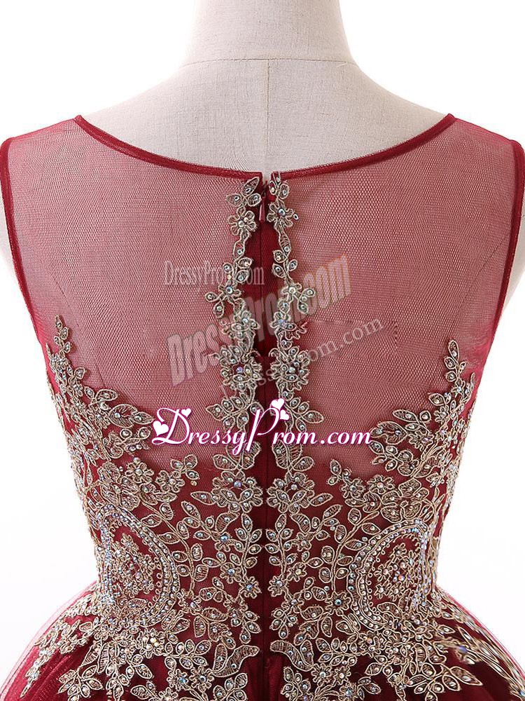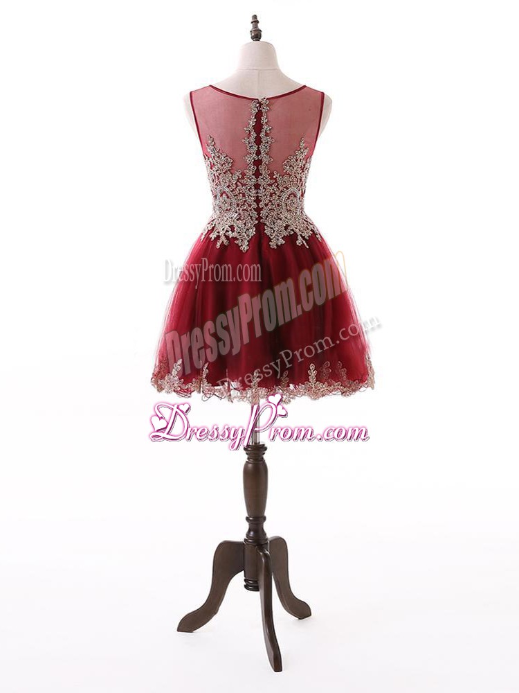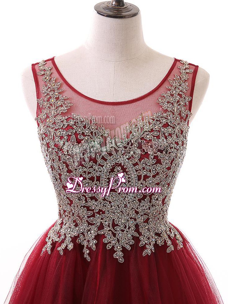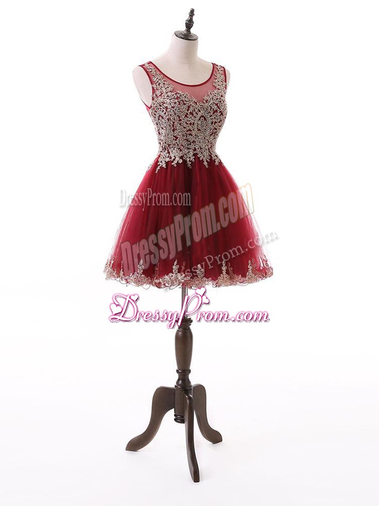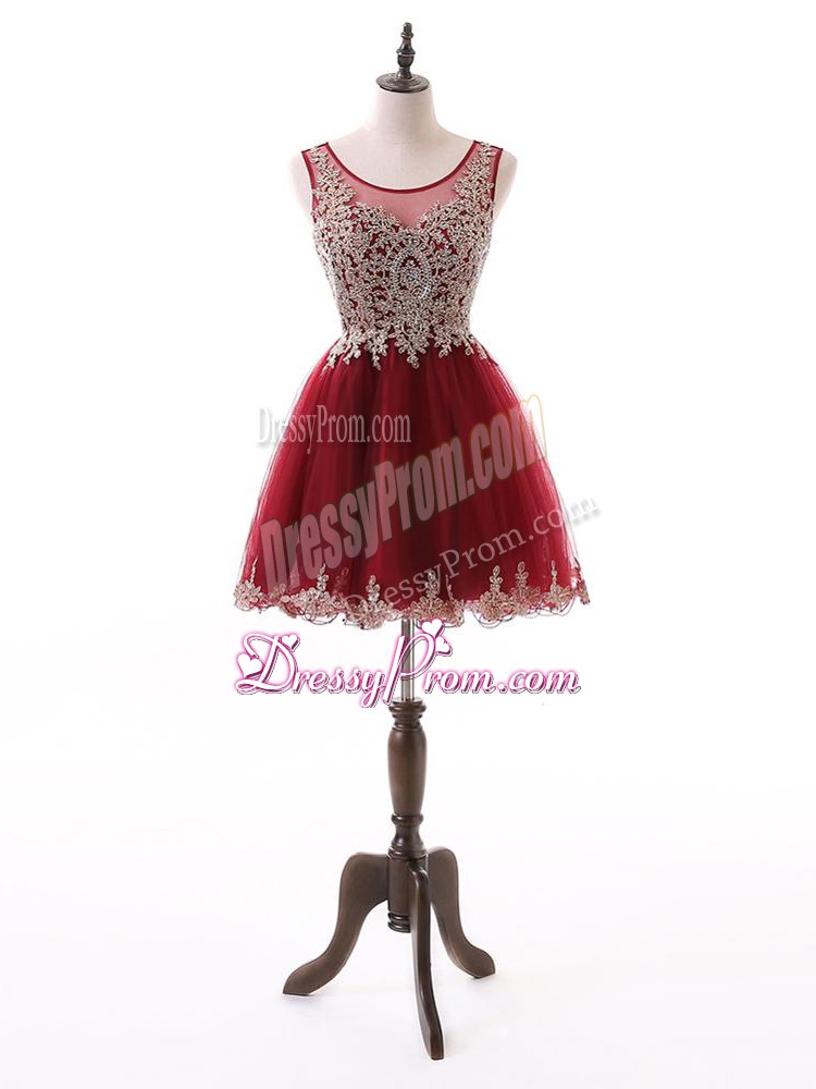 Neckline : ScoopShown Color : Wine RedSilhouette : A-lineSleeve Length : sleevelessHemline : mini lengthBack Detail : ZipperFabric : TulleEmbellishment : Beading,Lace,AppliquesOccasion : Prom,PartySeason : Spring,Summer,Fall