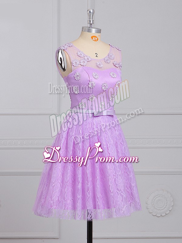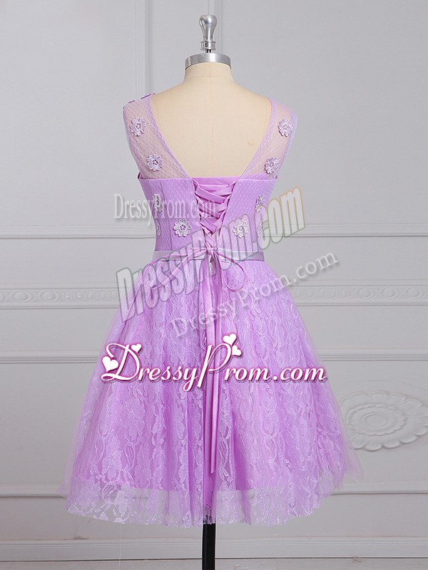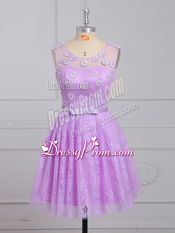 Neckline : ScoopShown Color : LilacSilhouette : EmpireSleeve Length : sleevelessHemline : mini lengthBack Detail : Lace upFabric : LaceEmbellishment : Appliques,BeltOccasion : Prom,Party,Wedding PartySeason : Spring,Summer,Fall