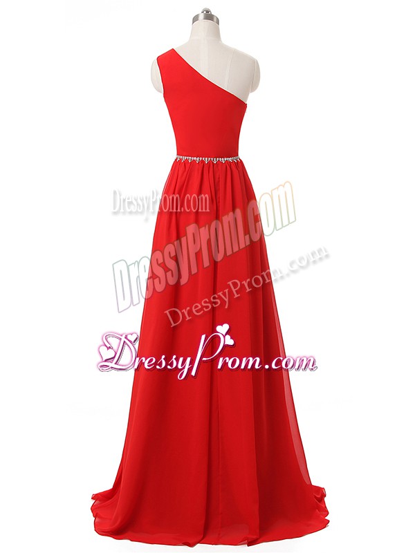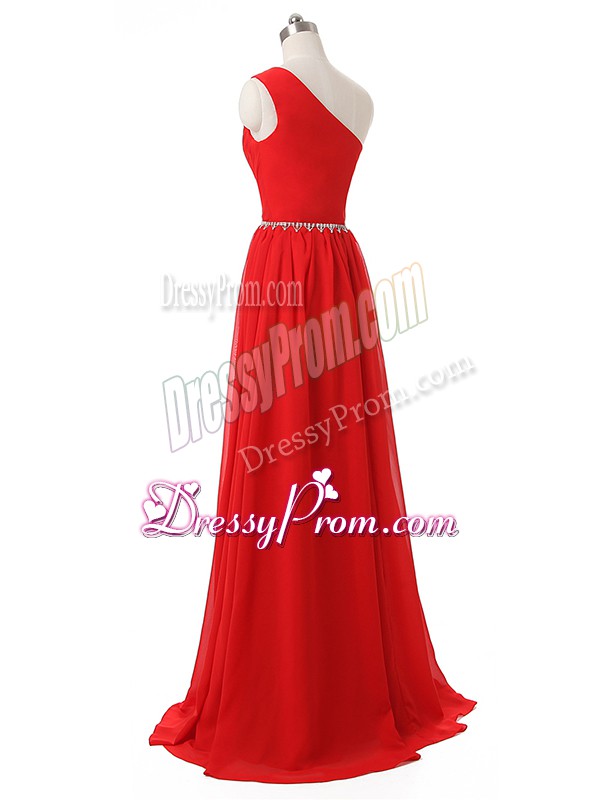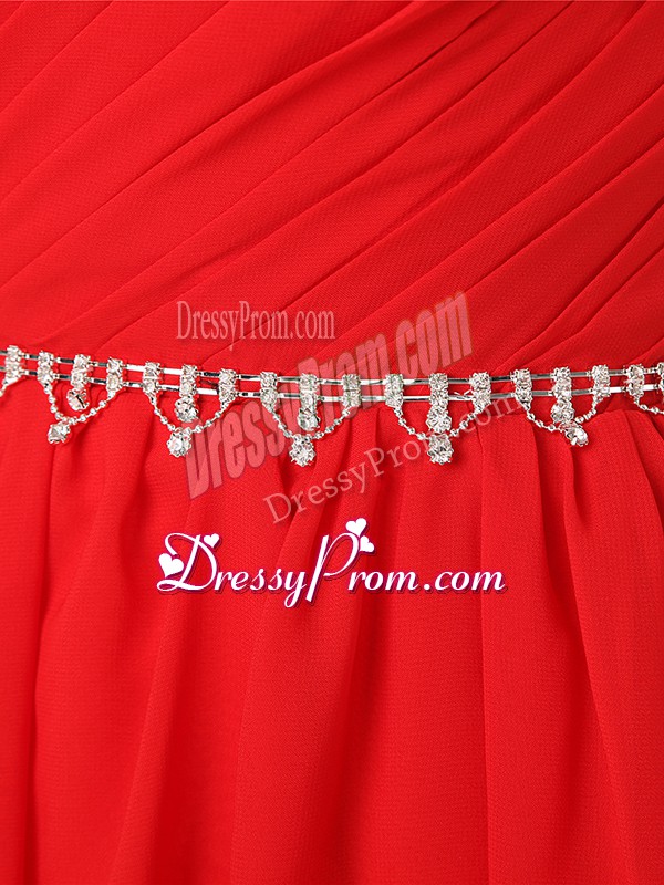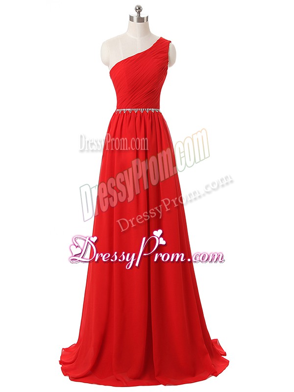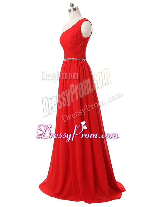 Neckline : One shoulderShown Color : RedSilhouette : EmpireSleeve Length : sleevelessHemline : floor lengthBack Detail : Side zipperFabric : ChiffonEmbellishment : Beading,RuchingOccasion : Prom,Party,Wedding PartySeason : Spring,Summer,Fall,Winter