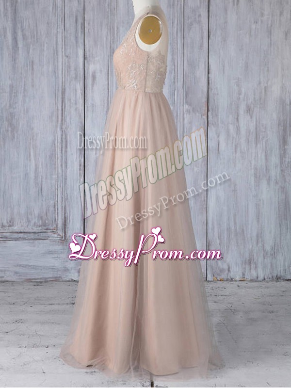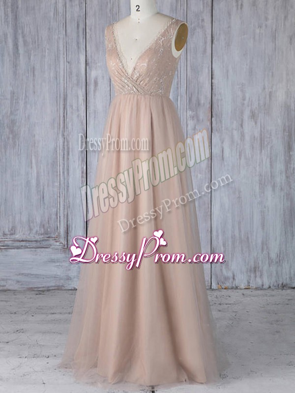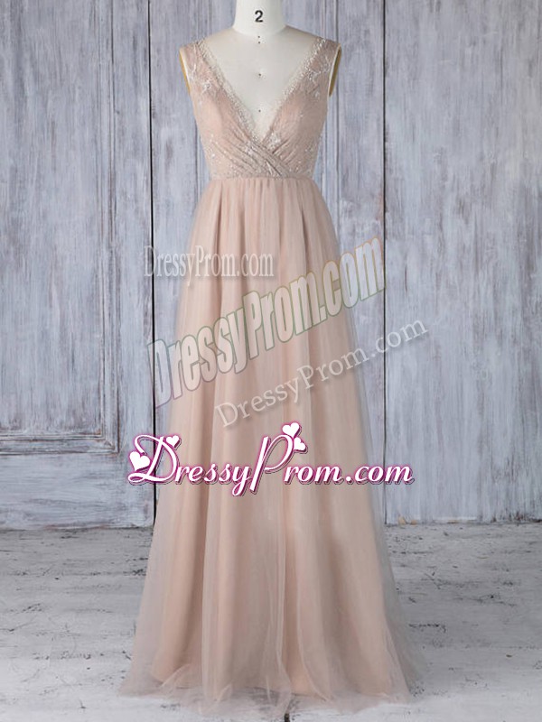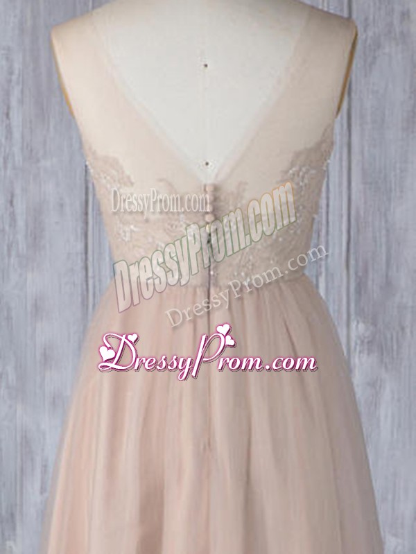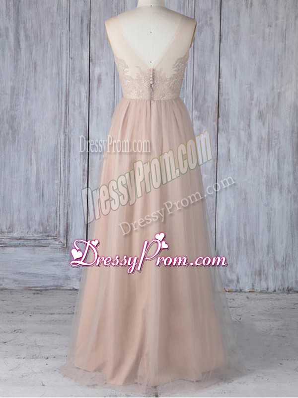Neckline : V-neckShown Color : PeachSilhouette : EmpireSleeve Length : sleevelessHemline : floor lengthBack Detail : ZipperFabric : TulleEmbellishment : LaceOccasion : Prom,Party,Wedding PartySeason : Spring,Summer,Fall,Winter