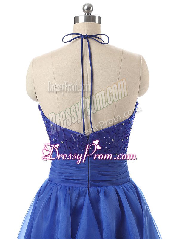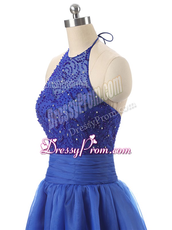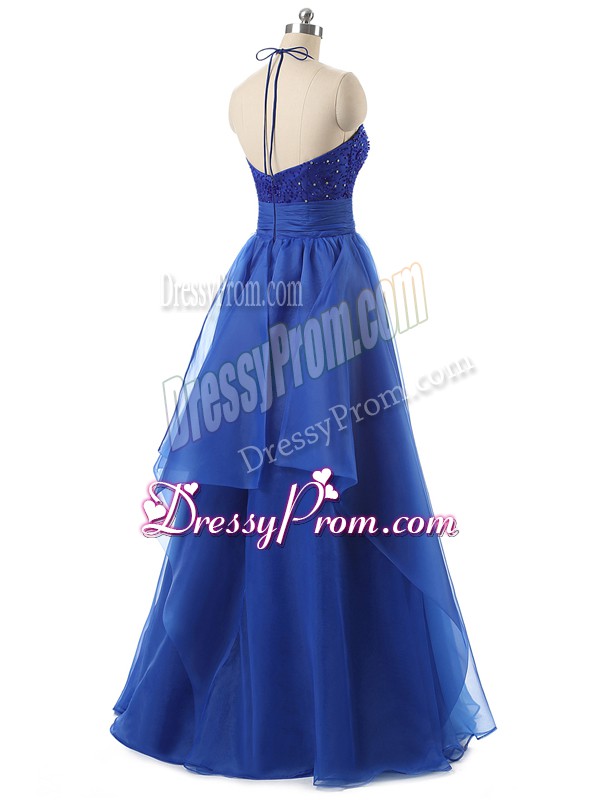 Neckline : Halter topShown Color : BlueSilhouette : A-lineSleeve Length : sleevelessHemline : floor lengthBack Detail : ZipperFabric : OrganzaEmbellishment : Beading,RufflesOccasion : Prom,Military BallSeason : Spring,Summer,Fall,Winter