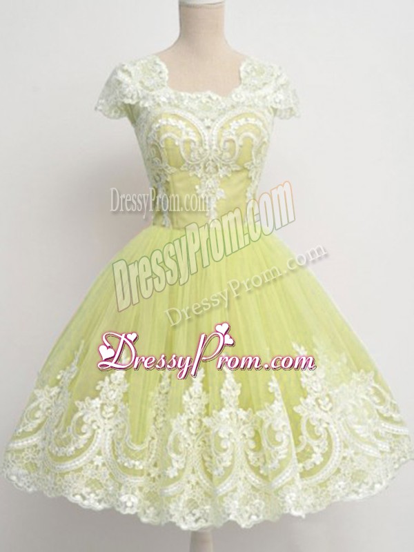 Neckline : SquareShown Color : Yellow GreenSilhouette : A-lineSleeve Length : cap sleevesHemline : knee lengthBack Detail : ZipperFabric : TulleEmbellishment : LaceOccasion : Prom,Party,Wedding PartySeason : Spring,Summer,Fall