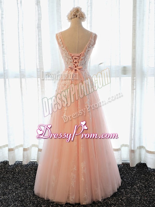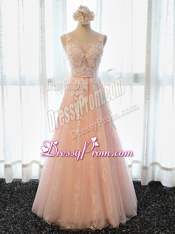 Neckline : ScoopShown Color : PeachSilhouette : A-lineSleeve Length : sleevelessHemline : floor lengthBack Detail : Lace upFabric : TulleEmbellishment : AppliquesOccasion : Prom,Party,Military BallSeason : Spring,Summer,Fall,Winter