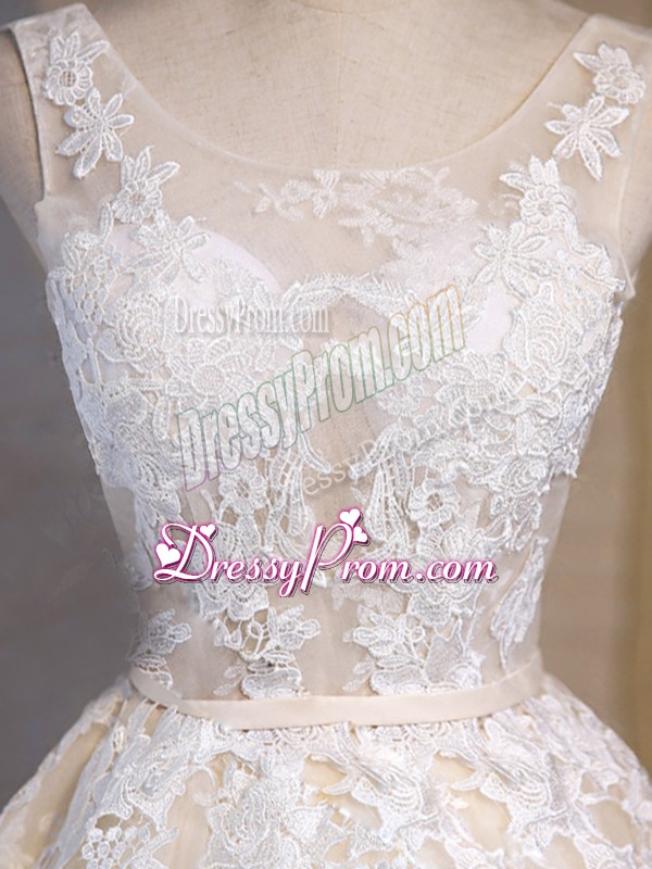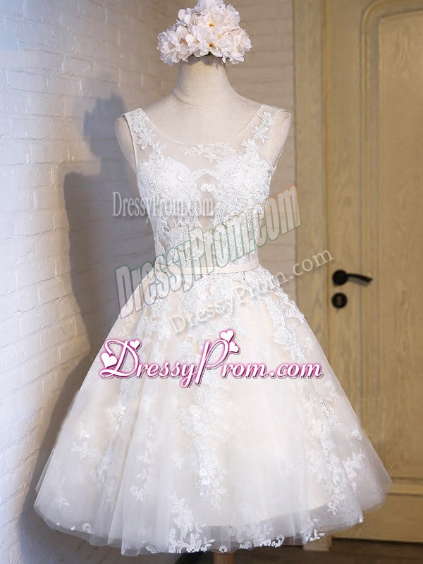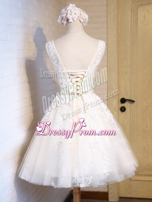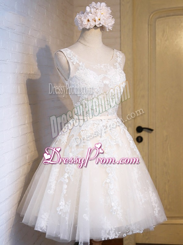Neckline : ScoopShown Color : WhiteSilhouette : A-lineSleeve Length : sleevelessHemline : mini lengthBack Detail : Lace upFabric : TulleEmbellishment : AppliquesOccasion : Prom,Party,Sweet 16Season : Spring,Summer,Fall