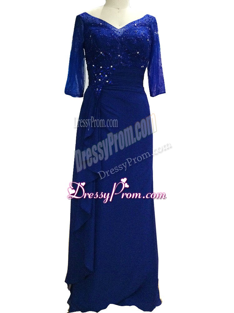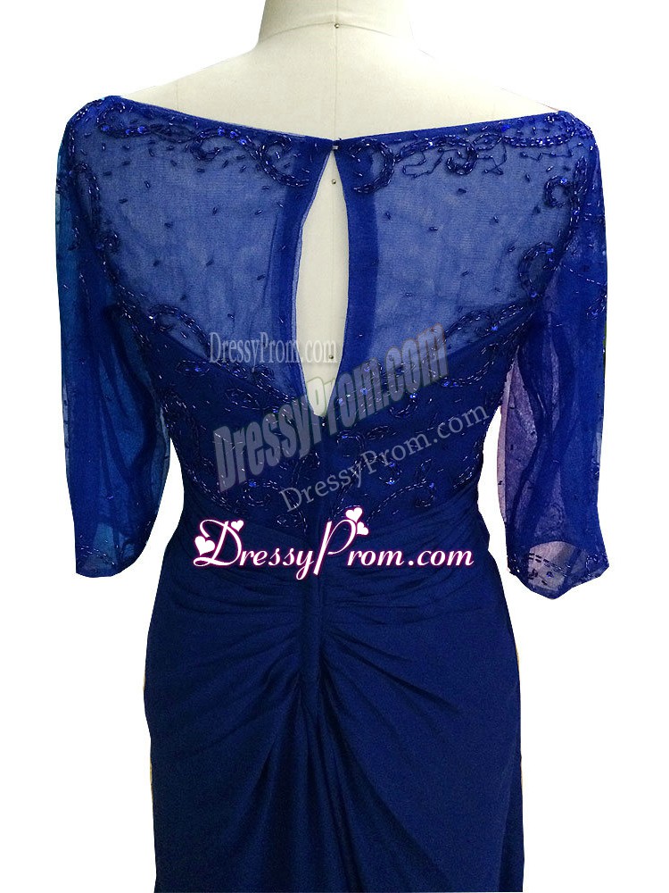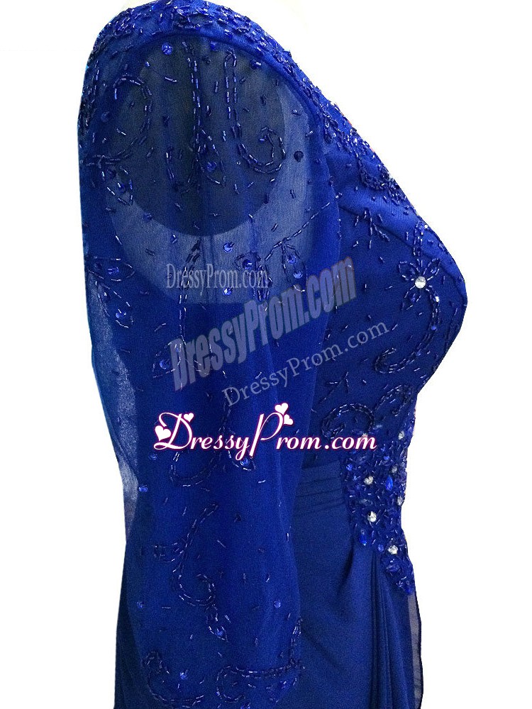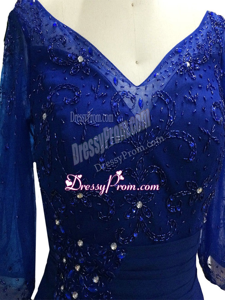 Neckline : V-neckShown Color : Royal BlueSilhouette : Column/SheathSleeve Length : sleevelessHemline : floor lengthBack Detail : ZipperFabric : ChiffonEmbellishment : BeadingOccasion : Prom,PartySeason : Spring,Summer,Fall,Winter