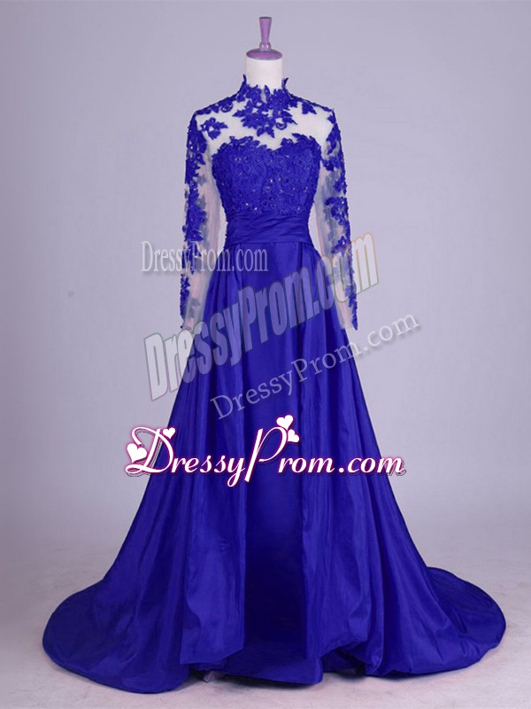 Royal Blue High-neck Lace Up Lace and Appliques Evening Dress Brush Train Sleeveless