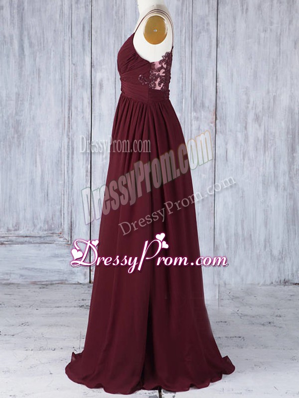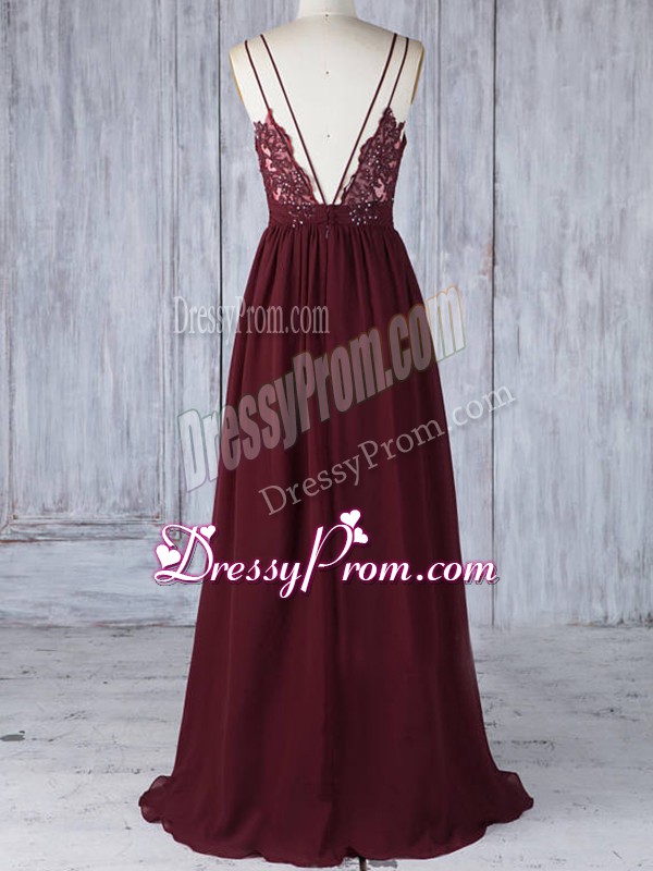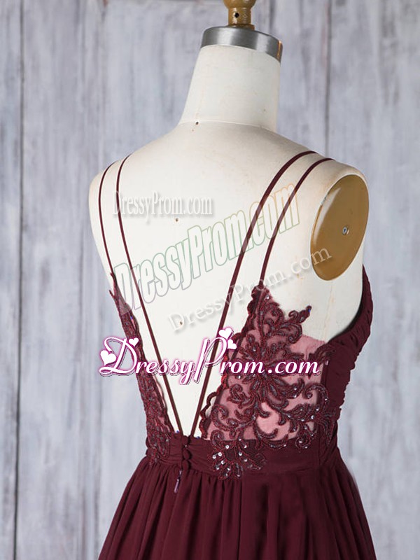 Neckline : StrapsShown Color : BurgundySilhouette : EmpireSleeve Length : sleevelessHemline : floor lengthBack Detail : ZipperFabric : ChiffonEmbellishment : AppliquesOccasion : Prom,Party,Wedding PartySeason : Spring,Summer,Fall,Winter