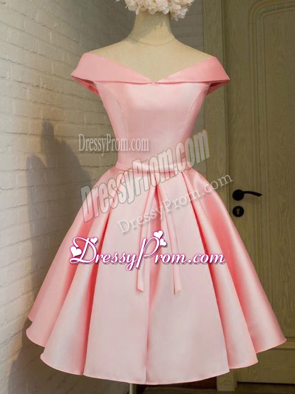Neckline : Off the shoulderShown Color : Baby PinkSilhouette : A-lineSleeve Length : 3|4 length sleeveHemline : knee lengthBack Detail : Lace upFabric : TaffetaEmbellishment : BeltOccasion : Prom,Party,Wedding PartySeason : Spring,Summer,Fall