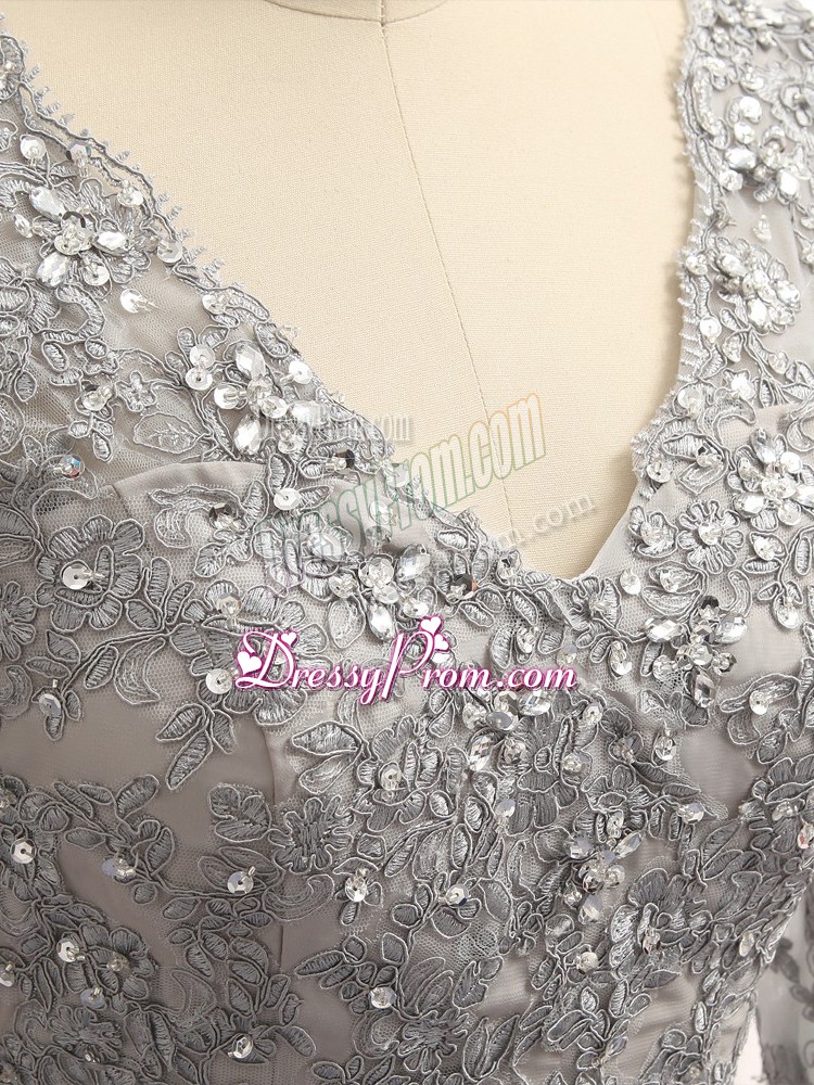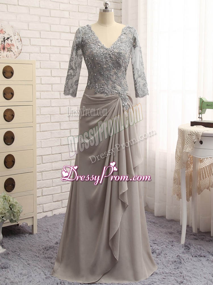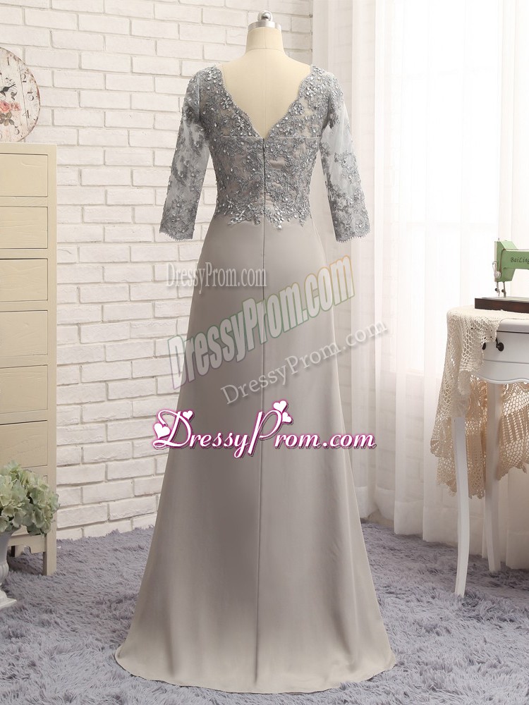 Neckline : V-neckShown Color : GreySilhouette : Column/SheathSleeve Length : long sleevesHemline : floor lengthBack Detail : ZipperFabric : ChiffonEmbellishment : Lace,AppliquesOccasion : Prom,Party,Beach,Wedding PartySeason : Spring,Summer,Fall