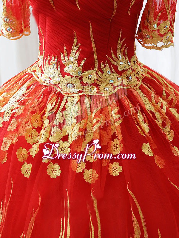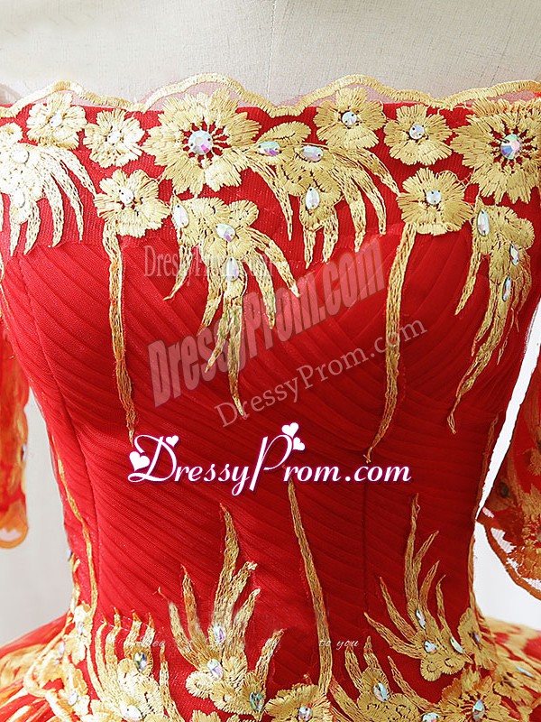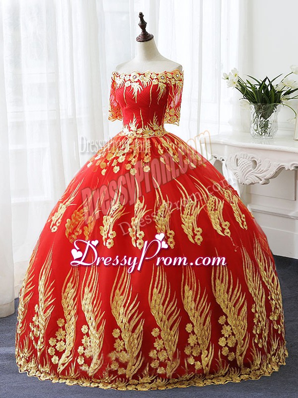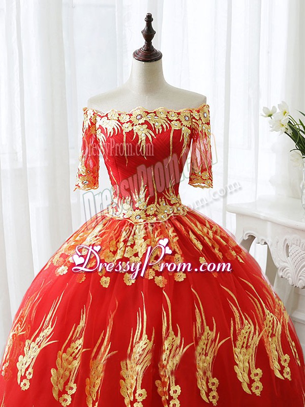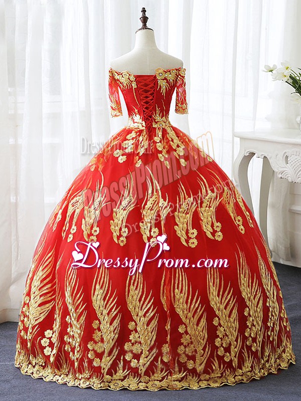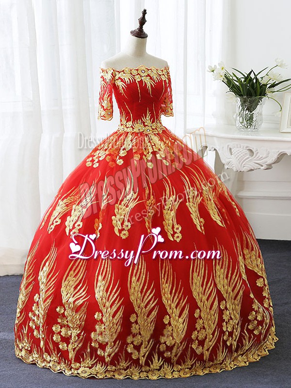 Neckline : Off the shoulderShown Color : RedSilhouette : Ball GownsSleeve Length : half sleevesHemline : floor lengthBack Detail : Lace upFabric : PrintedEmbellishment : AppliquesOccasion : Military Ball,Sweet 16,QuinceaneraSeason : Spring,Summer,Fall,Winter