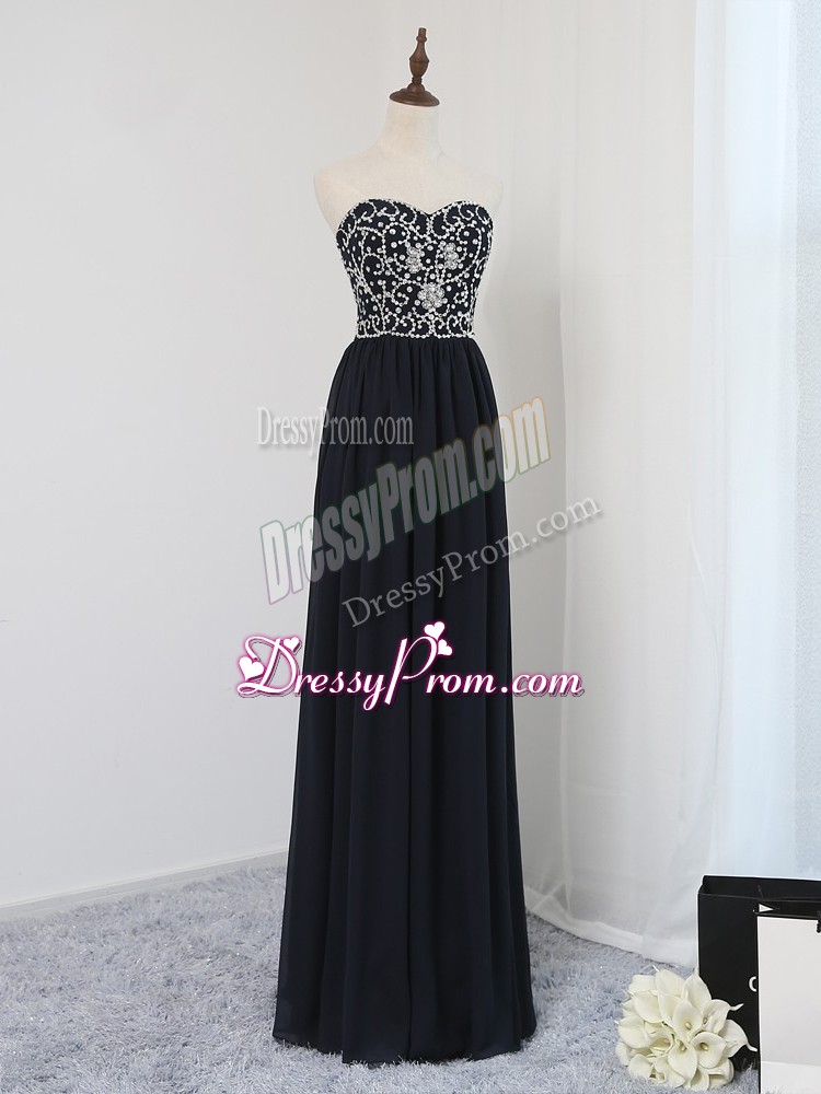 Neckline : SweetheartShown Color : BlackSilhouette : EmpireSleeve Length : sleevelessHemline : floor lengthBack Detail : ZipperFabric : ChiffonEmbellishment : BeadingOccasion : Prom,Party,Wedding PartySeason : Spring,Summer,Fall,Winter