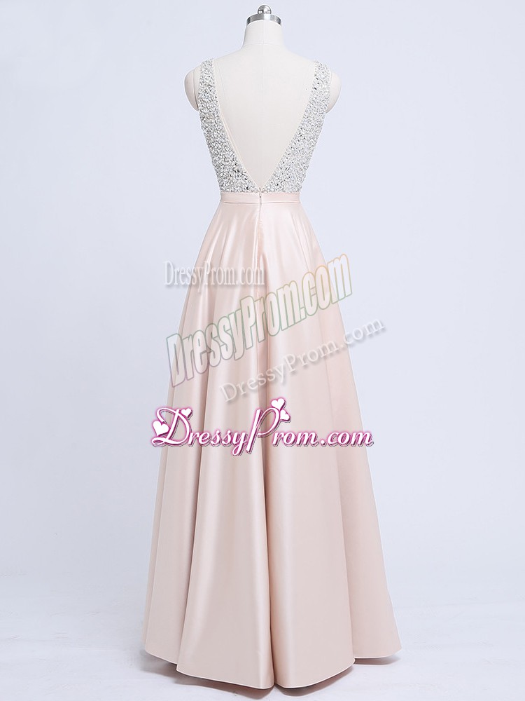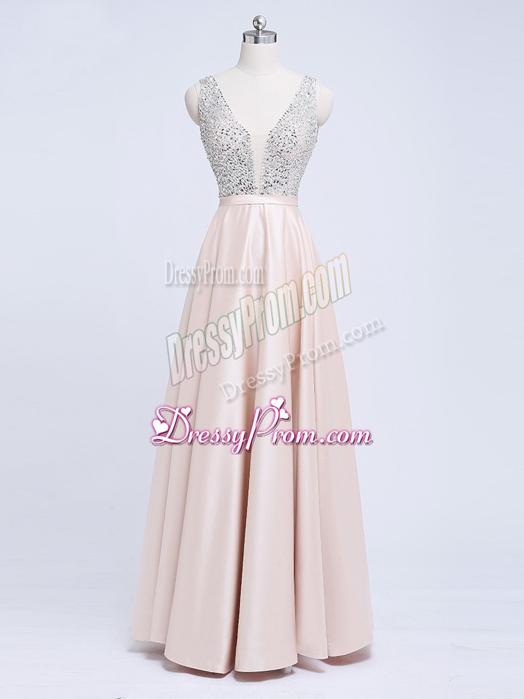 Neckline : V-neckShown Color : ChampagneSilhouette : EmpireSleeve Length : sleevelessHemline : floor lengthBack Detail : BacklessFabric : Elastic Woven SatinEmbellishment : Beading,BeltOccasion : Prom,Sweet 16,QuinceaneraSeason : Spring,Summer,Fall,Winter