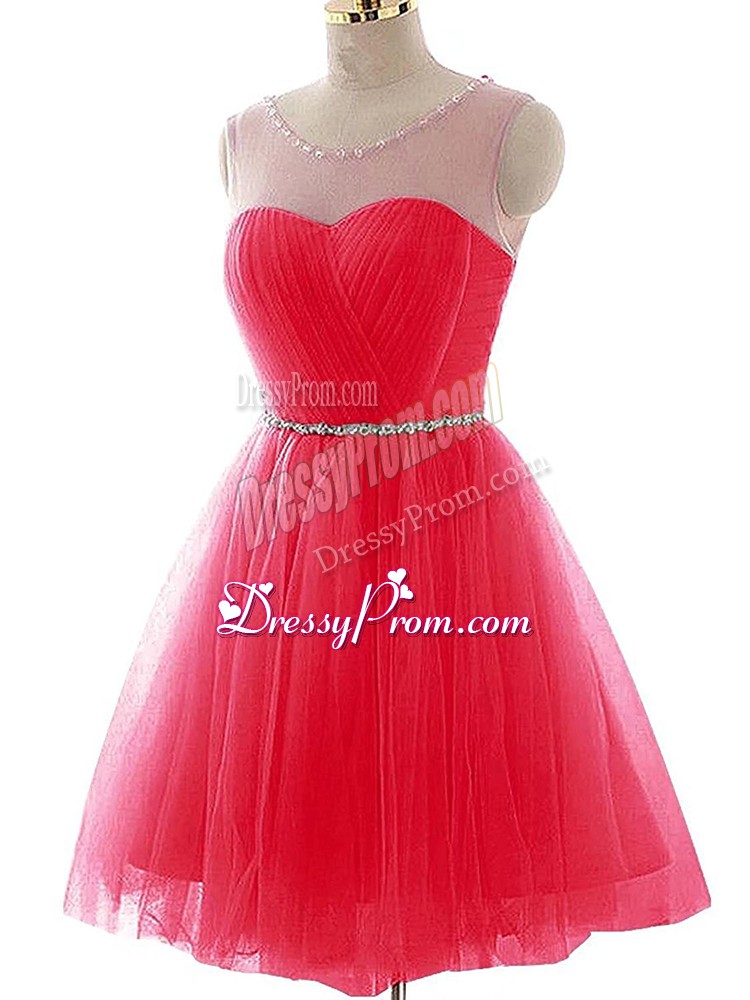 Neckline : ScoopShown Color : Coral RedSilhouette : A-lineSleeve Length : sleevelessHemline : mini lengthBack Detail : Lace upFabric : TulleEmbellishment : Beading,RuchingOccasion : Prom,Party,Sweet 16Season : Spring,Summer,Fall