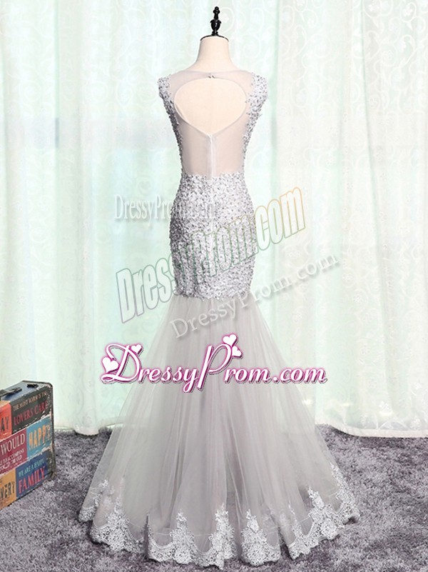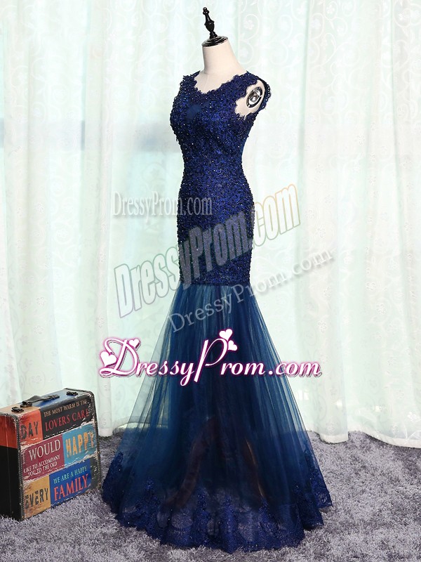 Neckline : ScoopShown Color : Navy BlueSilhouette : MermaidSleeve Length : sleevelessHemline : floor lengthBack Detail : ZipperFabric : TulleEmbellishment : Beading,Lace,AppliquesOccasion : Prom,Military Ball,Sweet 16Season : Spring,Summer,Fall,Winter