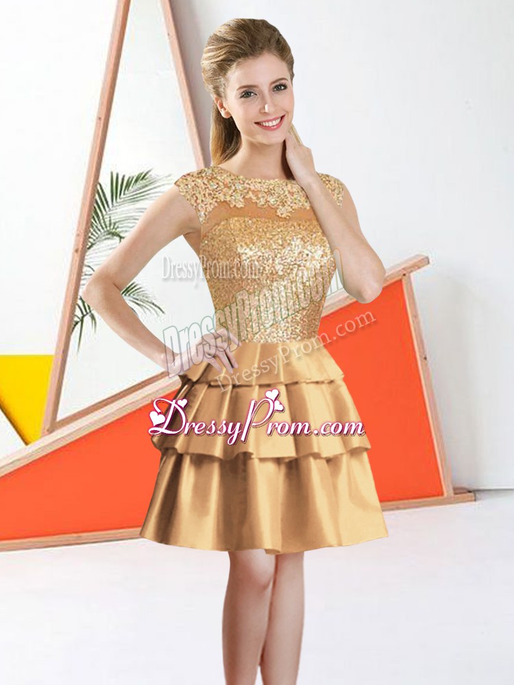 Neckline : BateauShown Color : GoldSilhouette : A-lineSleeve Length : sleevelessHemline : knee lengthBack Detail : BacklessFabric : TaffetaEmbellishment : Beading,LaceOccasion : Prom,PartySeason : Spring,Summer,Fall