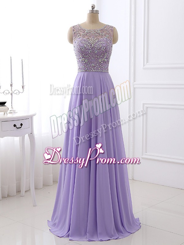 Neckline : ScoopShown Color : LavenderSilhouette : EmpireSleeve Length : sleevelessHemline : floor lengthBack Detail : ZipperFabric : ChiffonEmbellishment : BeadingOccasion : Prom,Party,Military Ball,Sweet 16Season : Spring,Summer,Fall,Winter