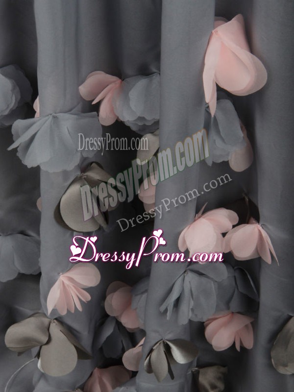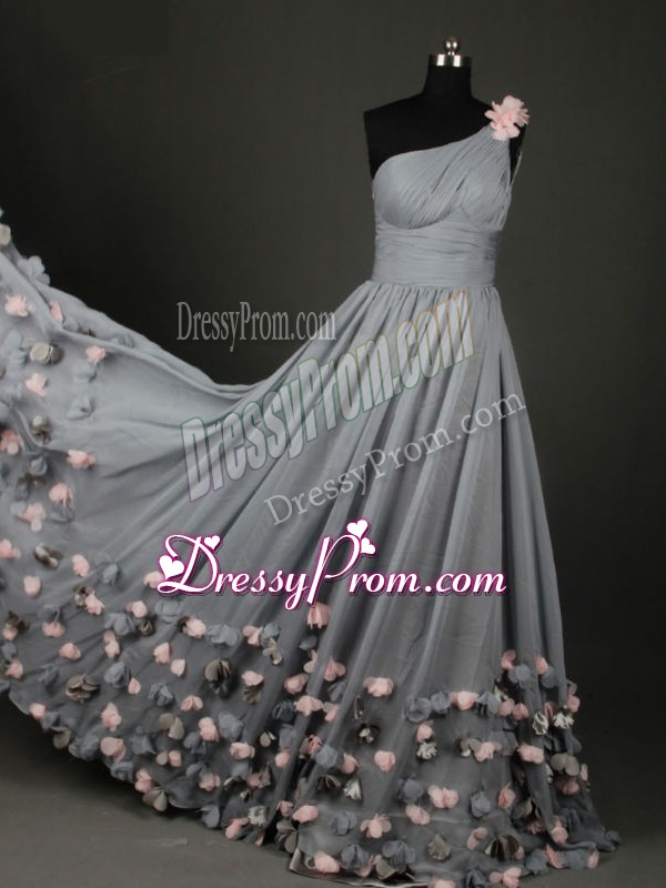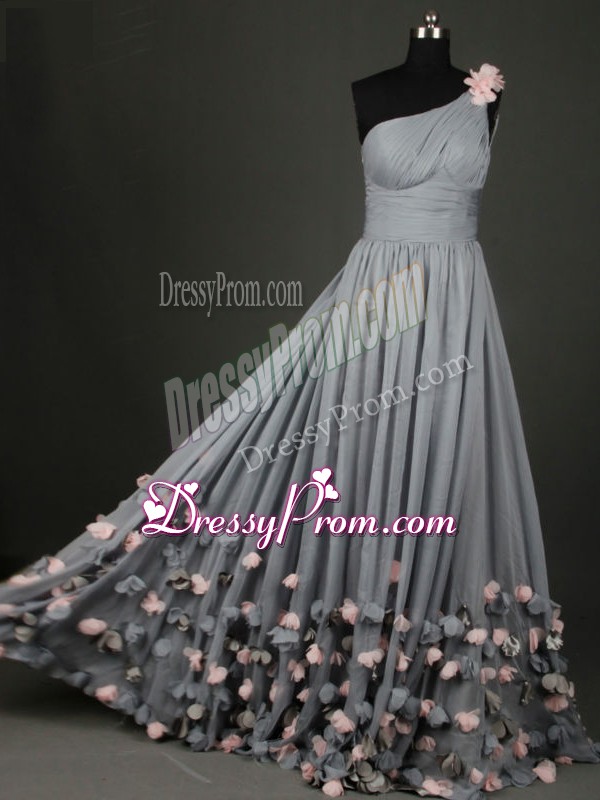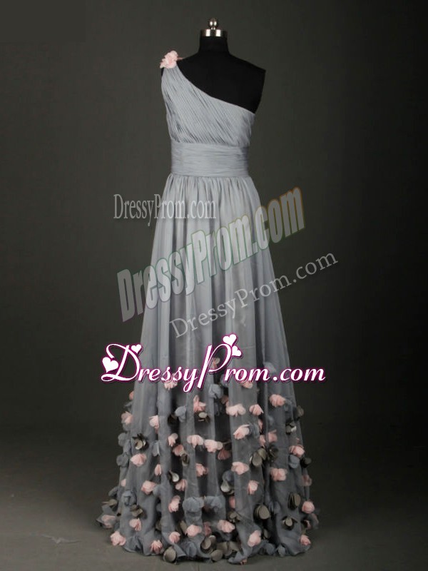 Neckline : One shoulderShown Color : GreySilhouette : A-lineSleeve Length : sleevelessHemline : floor lengthBack Detail : BacklessFabric : ChiffonEmbellishment : Pleated,Belt,Hand Made FlowerOccasion : Prom,Party,Sweet 16,BeachSeason : Spring,Summer,Fall,Winter