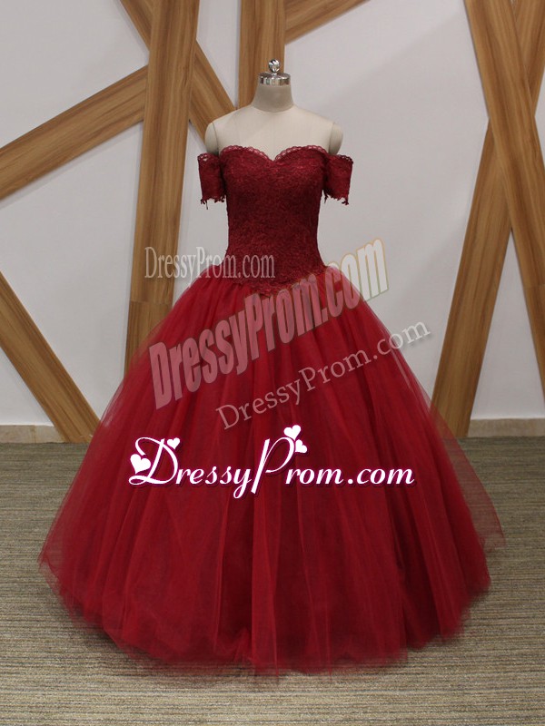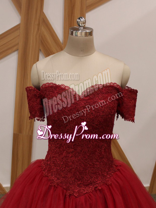Neckline : Off the shoulderShown Color : Wine RedSilhouette : Ball GownsSleeve Length : sleevelessHemline : floor lengthBack Detail : Lace upFabric : TulleEmbellishment : AppliquesOccasion : Prom,Military Ball,Sweet 16,QuinceaneraSeason : Spring,Summer,Fall,Winter