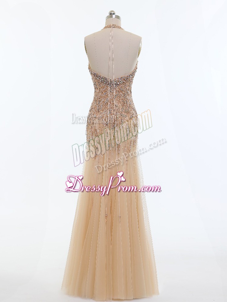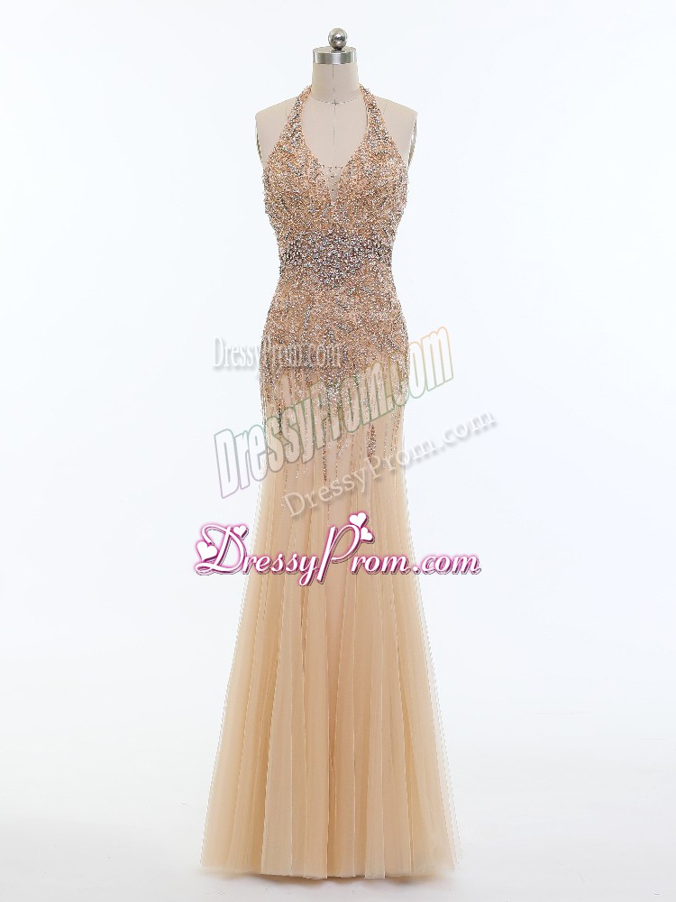 Neckline : Halter topShown Color : ChampagneSilhouette : MermaidSleeve Length : sleevelessHemline : floor lengthBack Detail : BacklessFabric : TulleEmbellishment : BeadingOccasion : Prom,Military BallSeason : Spring,Summer,Fall,Winter