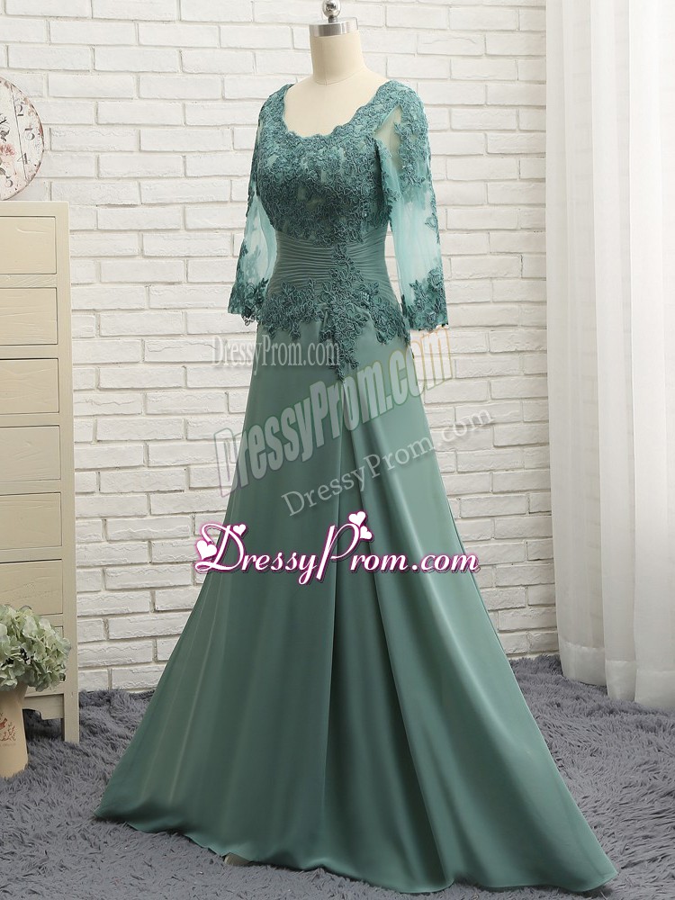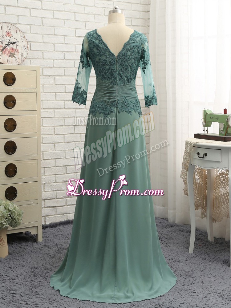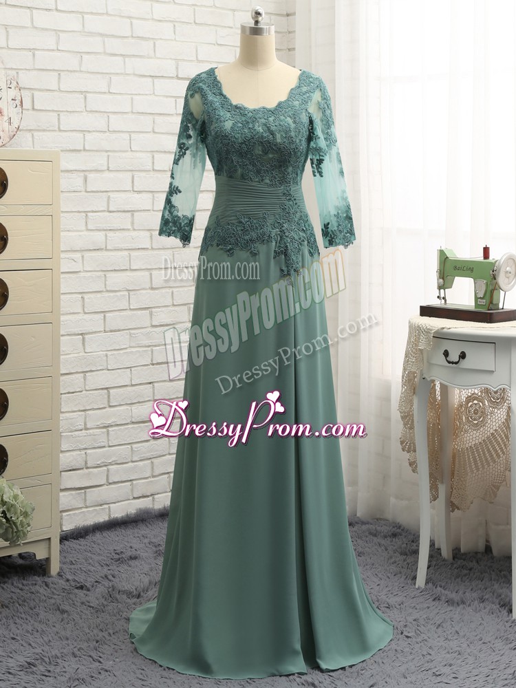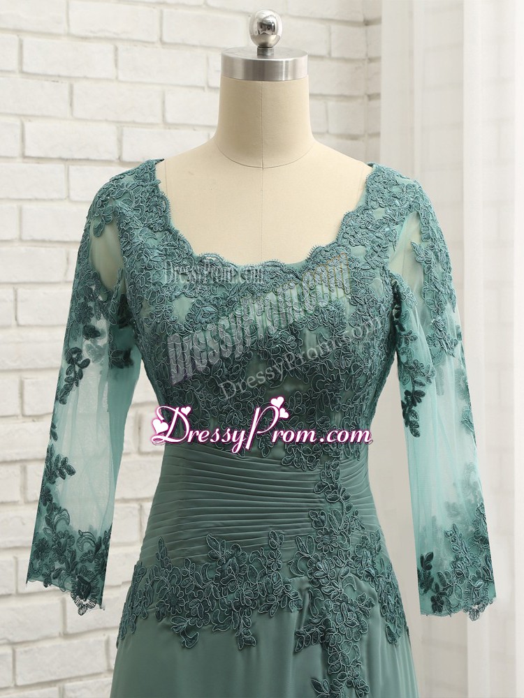 Neckline : ScallopedShown Color : GreenSilhouette : Column/SheathSleeve Length : long sleevesHemline : floor lengthBack Detail : ZipperFabric : ChiffonEmbellishment : Beading,Lace,AppliquesOccasion : Prom,Sweet 16Season : Spring,Summer,Fall,Winter