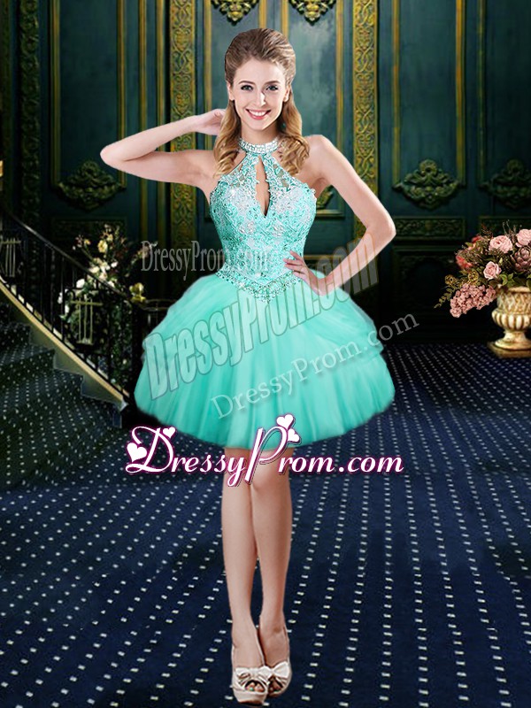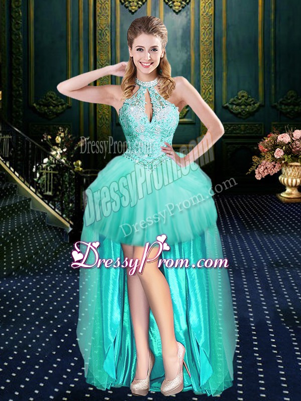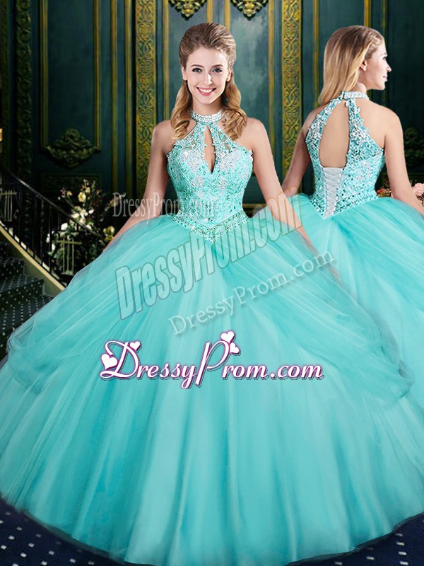 Neckline : Halter topShown Color : Aqua BlueSilhouette : Ball GownsSleeve Length : sleevelessHemline : floor lengthBack Detail : Lace upFabric : TulleEmbellishment : Beading,Pick UpsOccasion : Military Ball,Sweet 16,QuinceaneraSeason : Spring,Summer,Fall,Winter