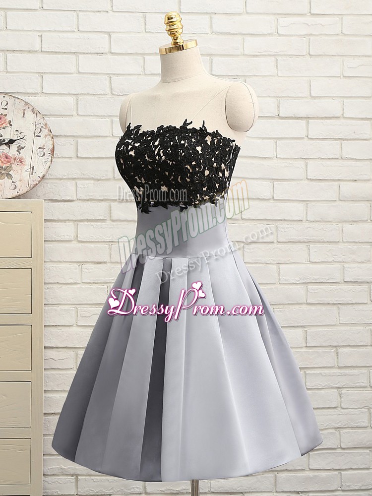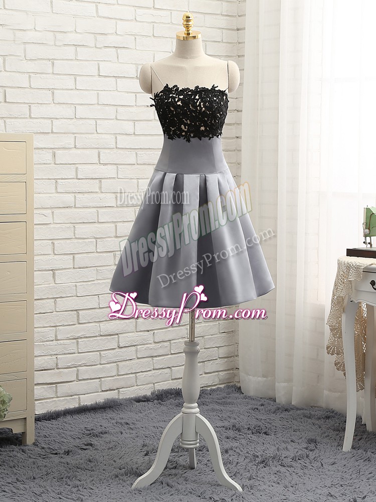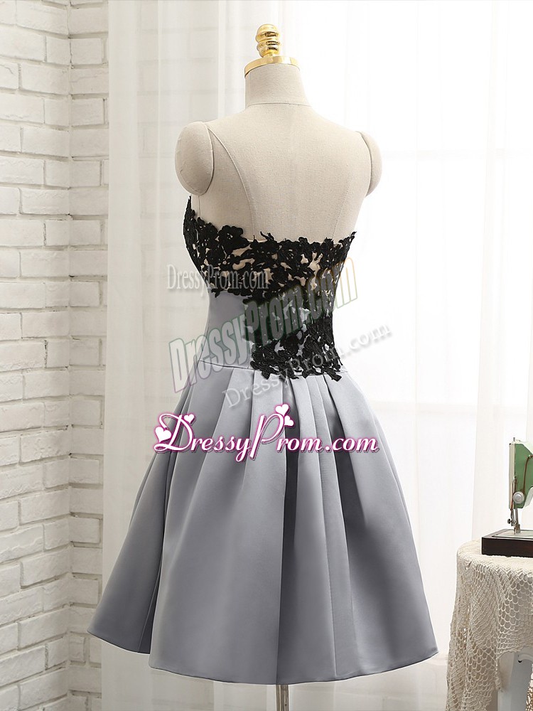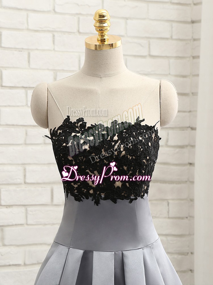 Neckline : StraplessShown Color : GreySilhouette : A-lineSleeve Length : sleevelessHemline : mini lengthBack Detail : Side zipperFabric : SatinEmbellishment : Lace,AppliquesOccasion : Prom,Party,Sweet 16Season : Spring,Summer,Fall