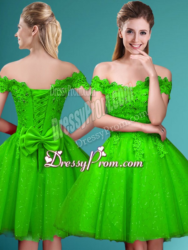 Neckline : Off the shoulder Shown Color : Spring Green Silhouette : A-line Sleeve Length : cap sleeves Hemline : knee length Back Detail : Lace up Fabric : Tulle Embellishment : Lace,Belt Occasion : Prom,Party Season : Spring,Summer,Fall