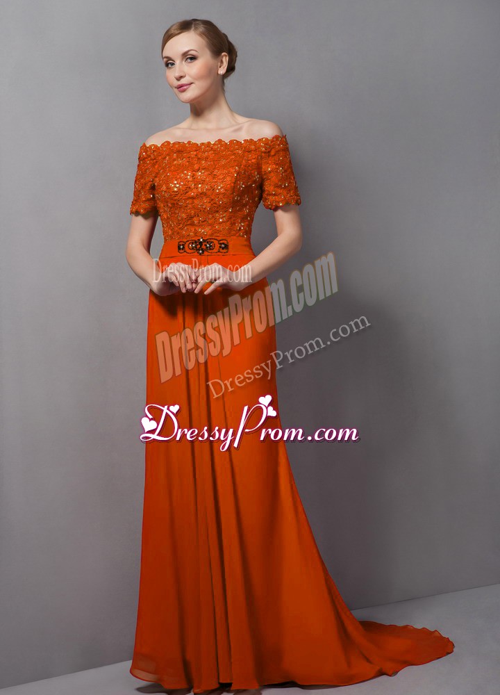 Neckline : Off the shoulderShown Color : OrangeSilhouette : EmpireSleeve Length : short sleevesBack Detail : ZipperFabric : ChiffonEmbellishment : LaceOccasion : Prom,PartySeason : Spring,Summer,Fall,Winter