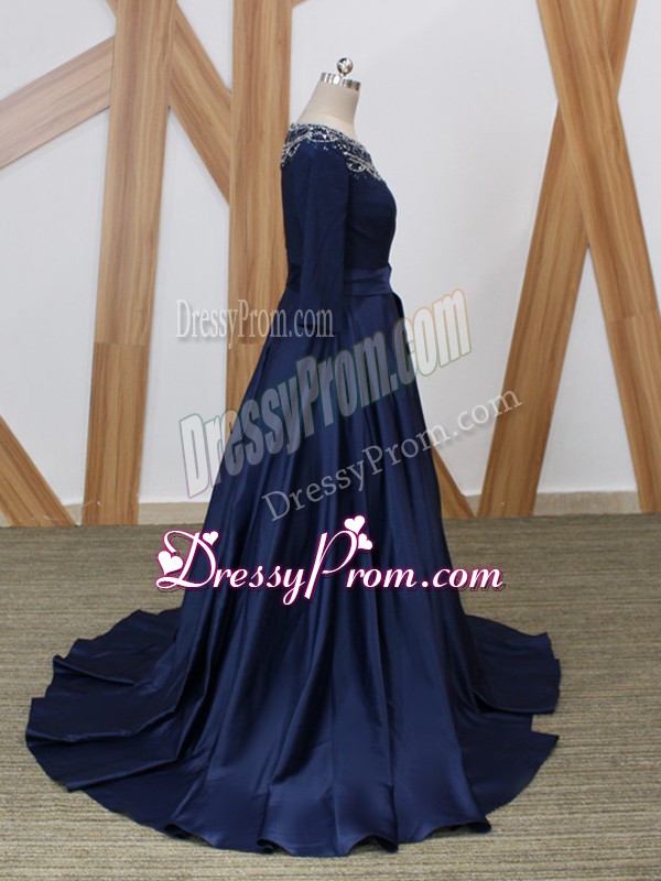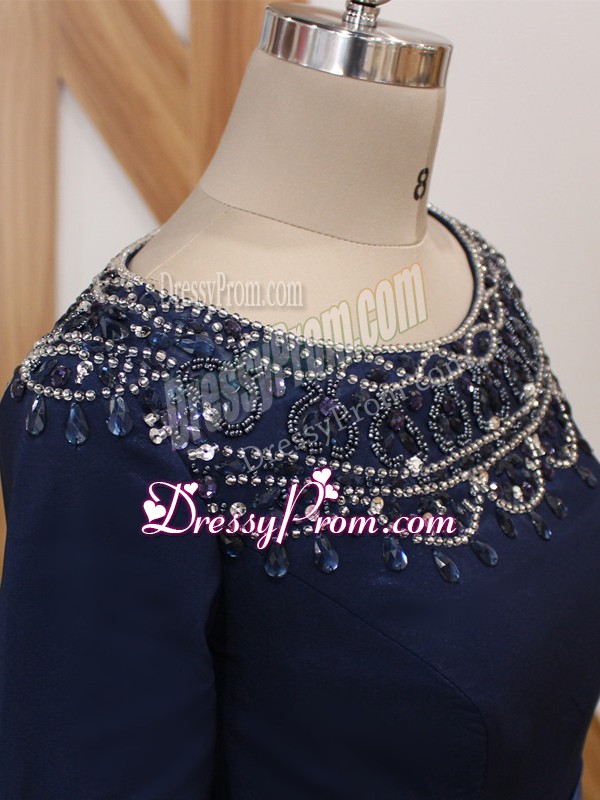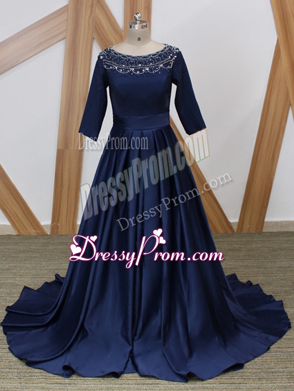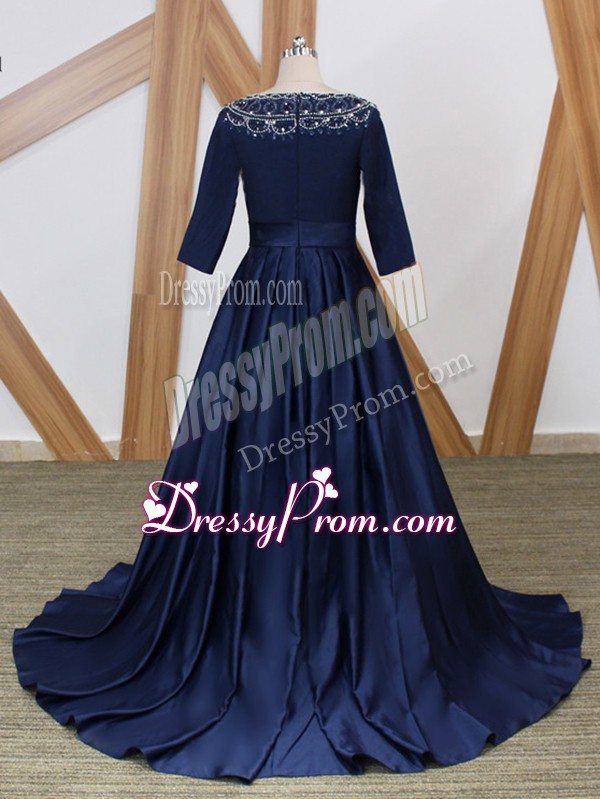 Neckline : ScoopShown Color : Navy BlueSilhouette : A-lineSleeve Length : 3|4 length sleeveBack Detail : ZipperFabric : SatinEmbellishment : BeadingOccasion : Prom,Military BallSeason : Spring,Summer,Fall,Winter