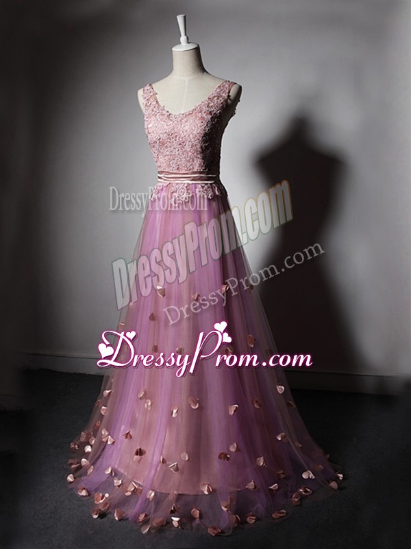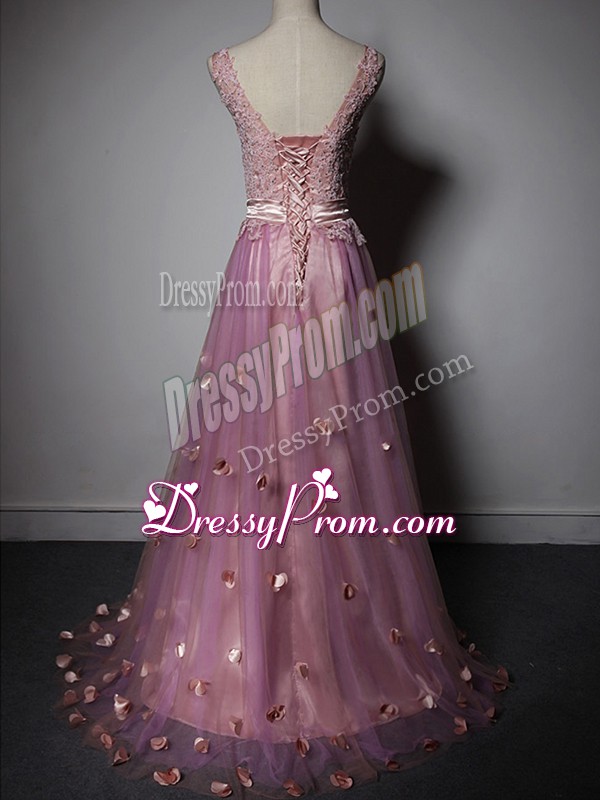 Neckline : V-neckShown Color : LilacSilhouette : A-lineSleeve Length : sleevelessBack Detail : Lace upFabric : TulleEmbellishment : Beading,Lace,Appliques,Hand Made FlowerOccasion : PromSeason : Spring,Summer,Fall,Winter