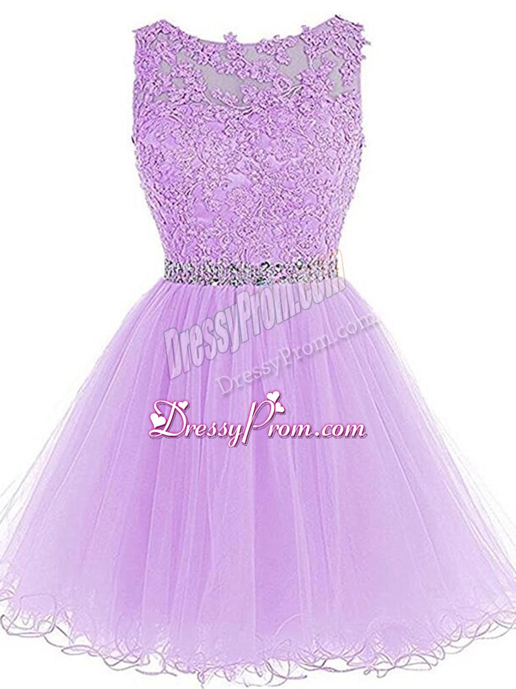 Neckline : ScoopShown Color : LavenderSilhouette : A-lineSleeve Length : sleevelessHemline : mini lengthBack Detail : ZipperFabric : TulleEmbellishment : Beading,Lace,AppliquesOccasion : Prom,Party,Sweet 16Season : Spring,Summer,Fall
