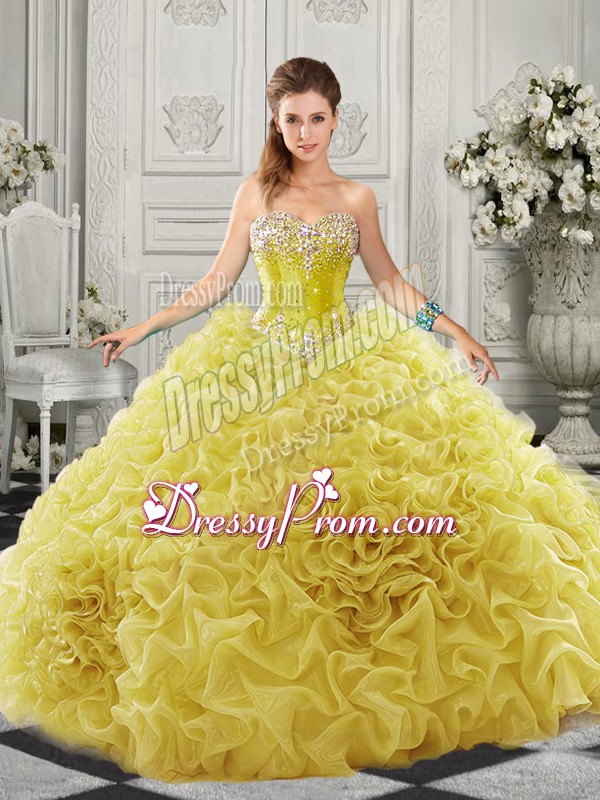 Neckline : SweetheartShown Color : YellowSilhouette : Ball GownsSleeve Length : sleevelessBack Detail : Lace upFabric : OrganzaEmbellishment : Beading,RufflesOccasion : Military Ball,Sweet 16,QuinceaneraSeason : Spring,Summer,Fall,Winter