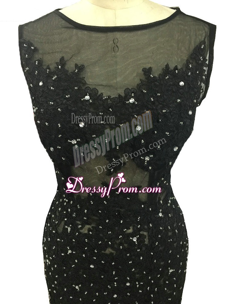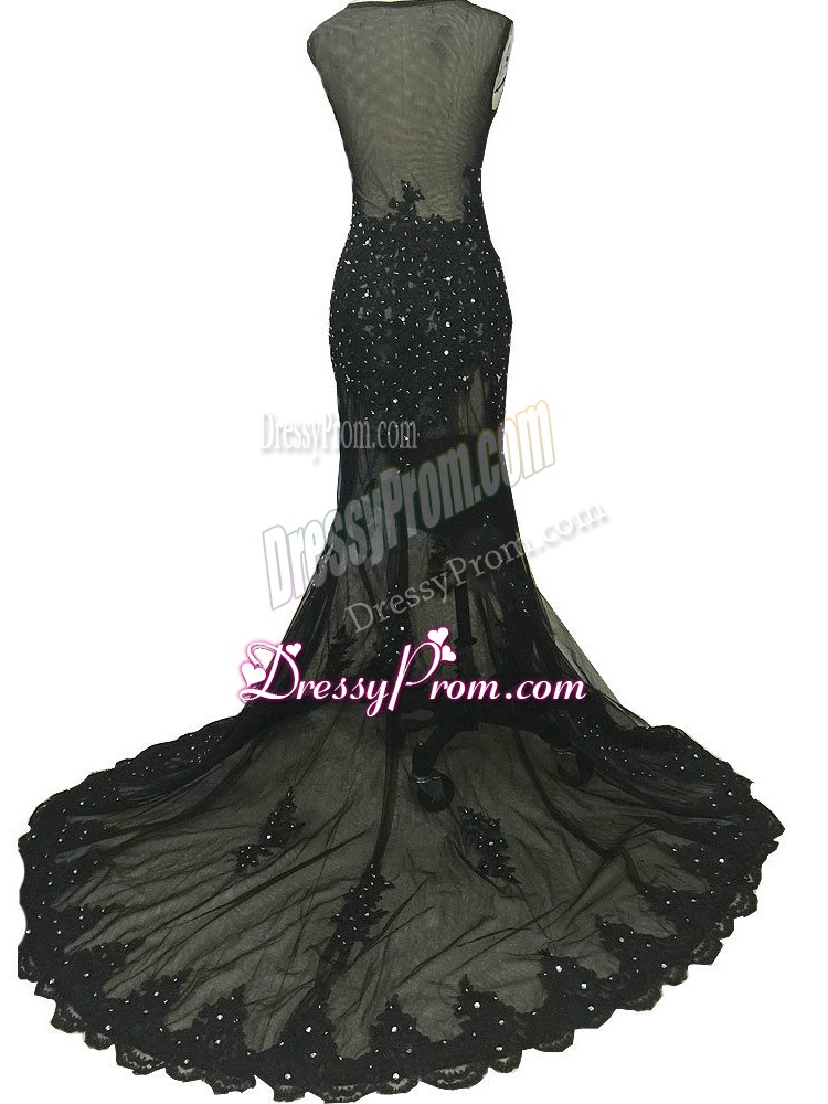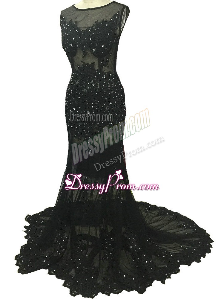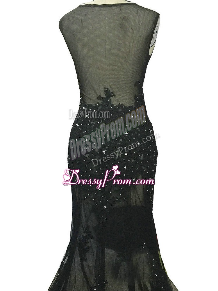 Neckline : ScoopShown Color : BlackSilhouette : MermaidSleeve Length : sleevelessBack Detail : Side zipperFabric : TulleEmbellishment : Beading,Lace,AppliquesOccasion : Prom,Military Ball,BeachSeason : Spring,Summer,Fall,Winter