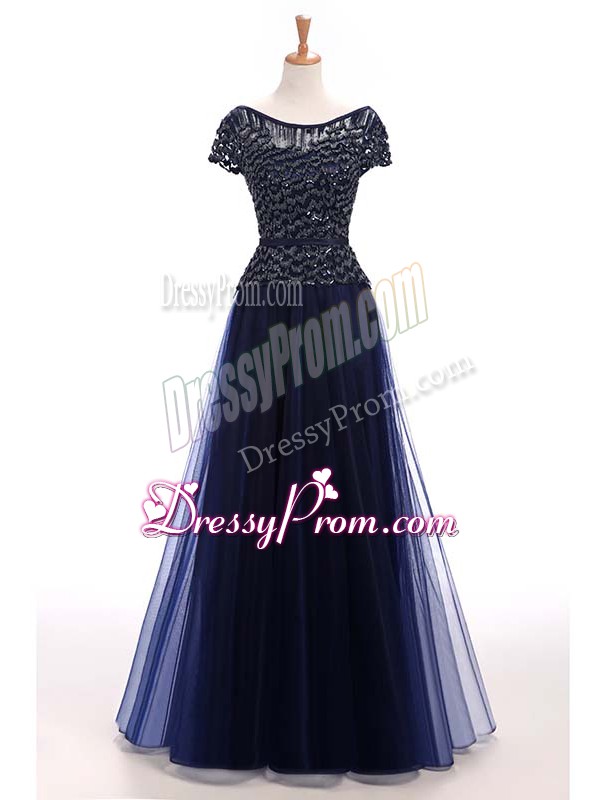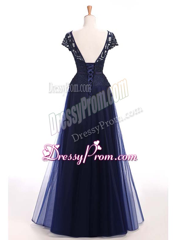 Neckline : ScoopShown Color : Navy BlueSilhouette : A-lineSleeve Length : short sleevesHemline : floor lengthBack Detail : Lace upFabric : TulleEmbellishment : BeadingOccasion : Prom,Military BallSeason : Spring,Summer,Fall,Winter