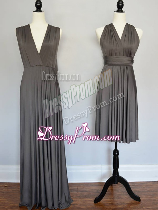 Neckline : V-neckShown Color : GreySilhouette : EmpireSleeve Length : sleevelessHemline : floor lengthBack Detail : Lace upFabric : ChiffonEmbellishment : RuchingOccasion : Prom,Wedding PartySeason : Spring,Summer,Fall,Winter