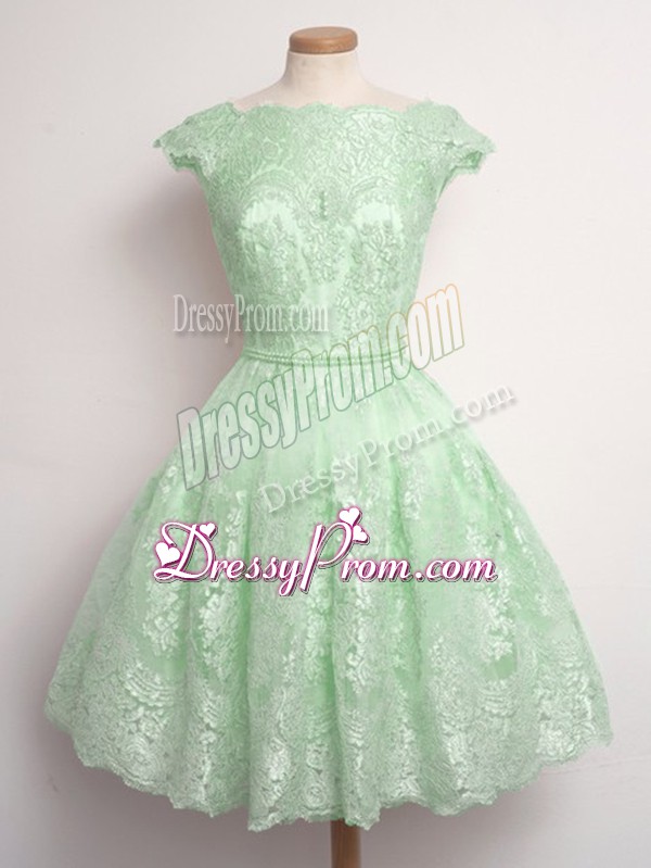 Neckline : ScallopedShown Color : Spring GreenSilhouette : A-lineSleeve Length : cap sleevesHemline : knee lengthBack Detail : Lace upFabric : LaceEmbellishment : LaceOccasion : Prom,Party,Wedding PartySeason : Spring,Summer,Fall