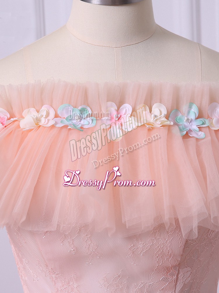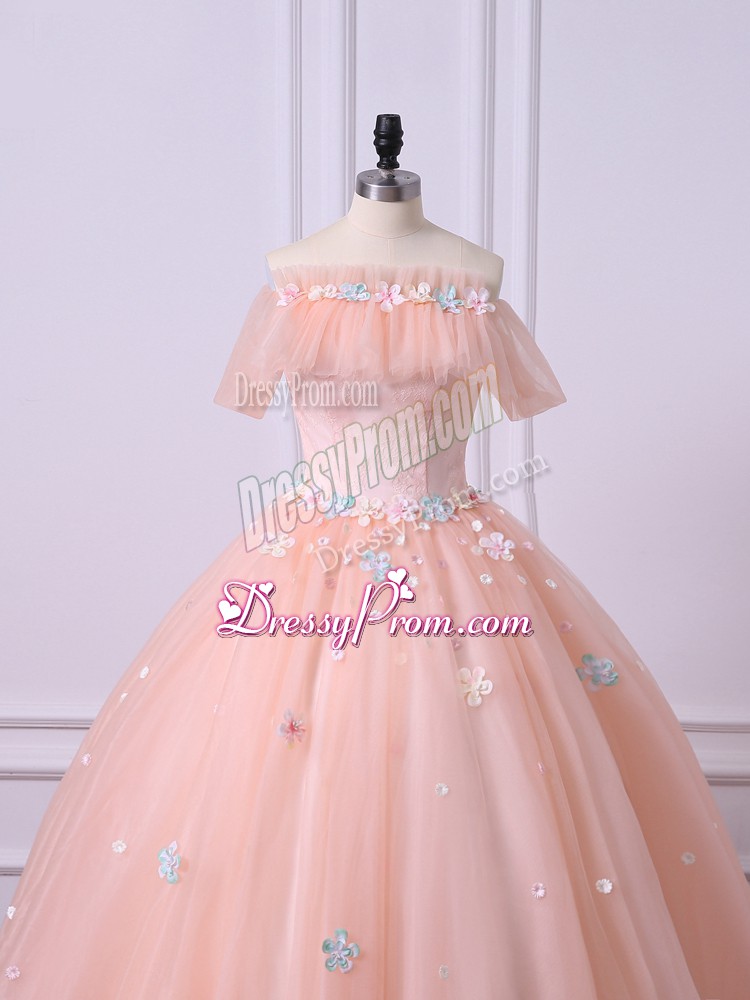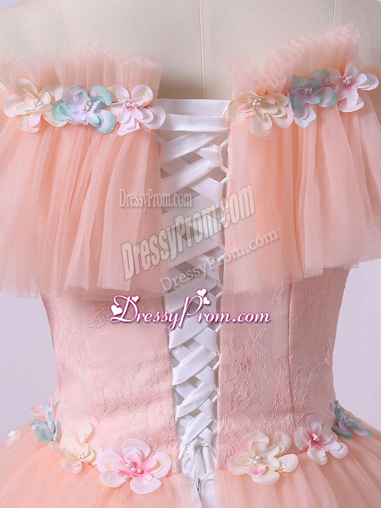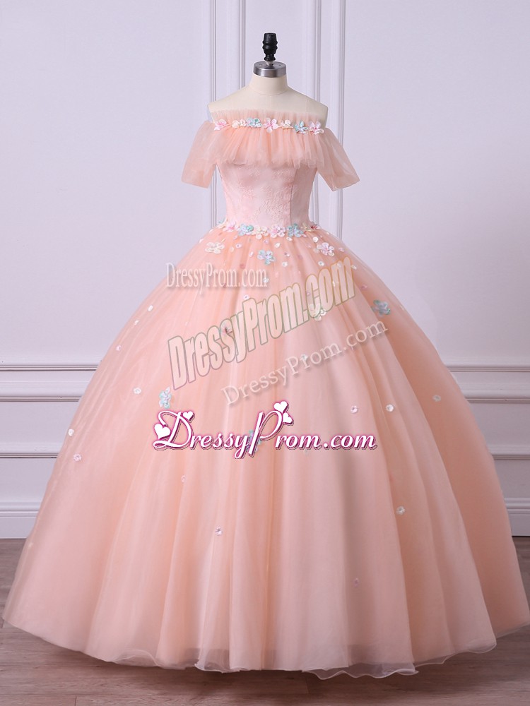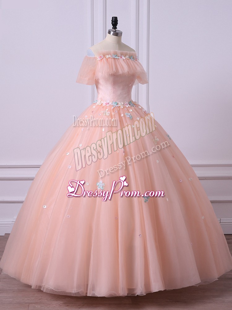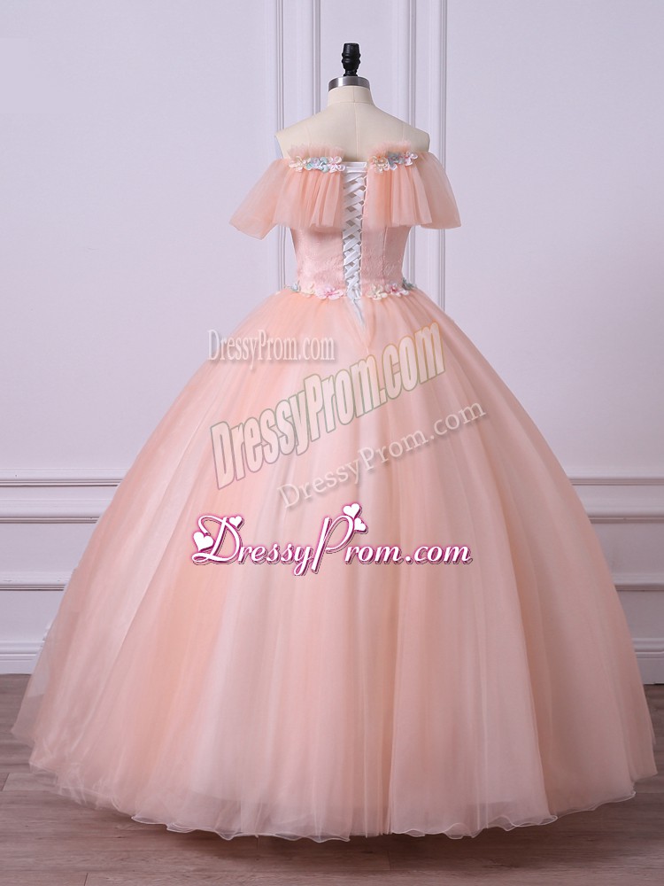 Neckline : Off the shoulderShown Color : PeachSilhouette : Ball GownsSleeve Length : short sleevesHemline : floor lengthBack Detail : Lace upFabric : TulleEmbellishment : Lace,AppliquesOccasion : Military Ball,Sweet 16,QuinceaneraSeason : Spring,Summer,Fall,Winter