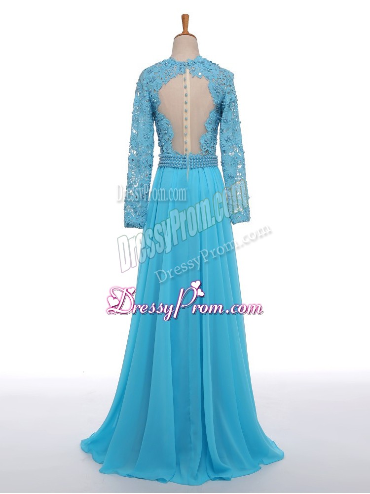 Neckline : V-neckShown Color : Baby BlueSilhouette : EmpireSleeve Length : long sleevesHemline : floor lengthBack Detail : ZipperFabric : ChiffonEmbellishment : LaceOccasion : Prom,BeachSeason : Spring,Summer,Fall,Winter