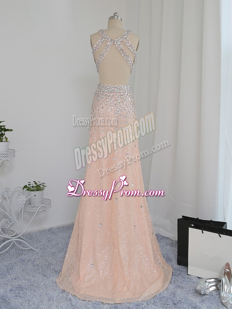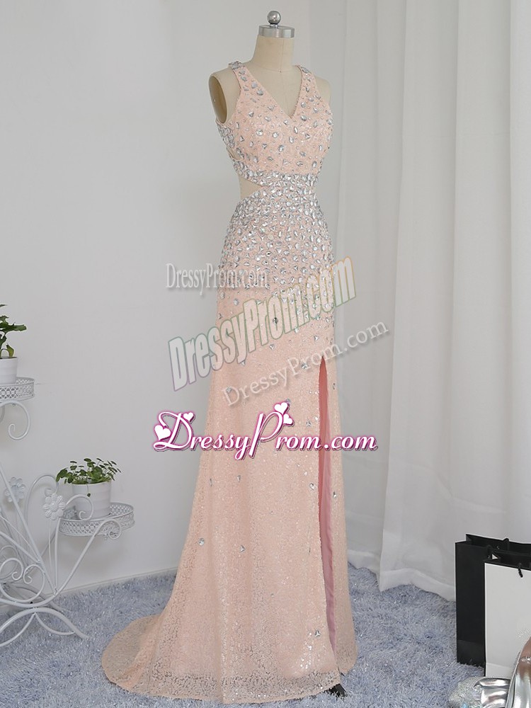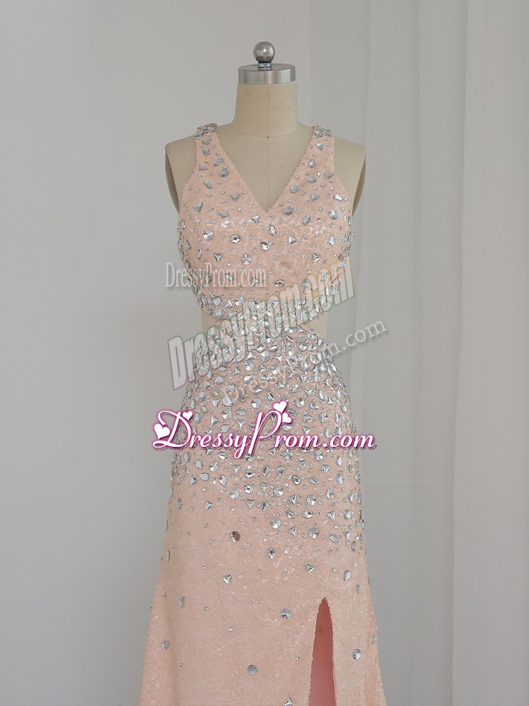 Neckline : V-neckShown Color : PeachSilhouette : Column/SheathSleeve Length : sleevelessHemline : floor lengthBack Detail : BacklessFabric : ChiffonEmbellishment : BeadingOccasion : Prom,Party,Wedding PartySeason : Spring,Summer,Fall,Winter