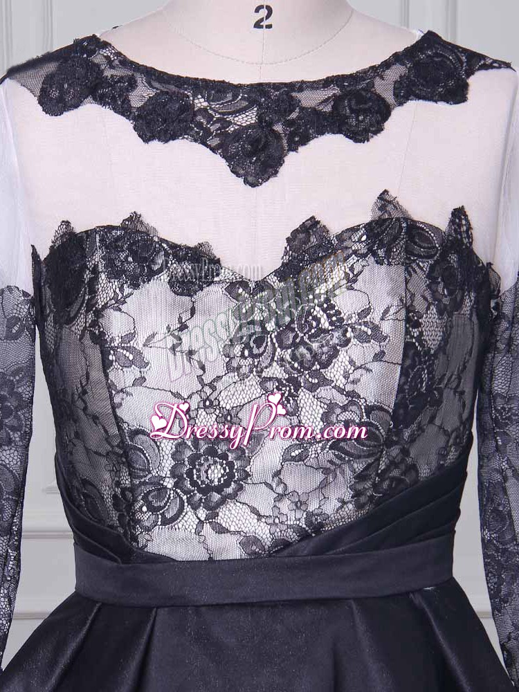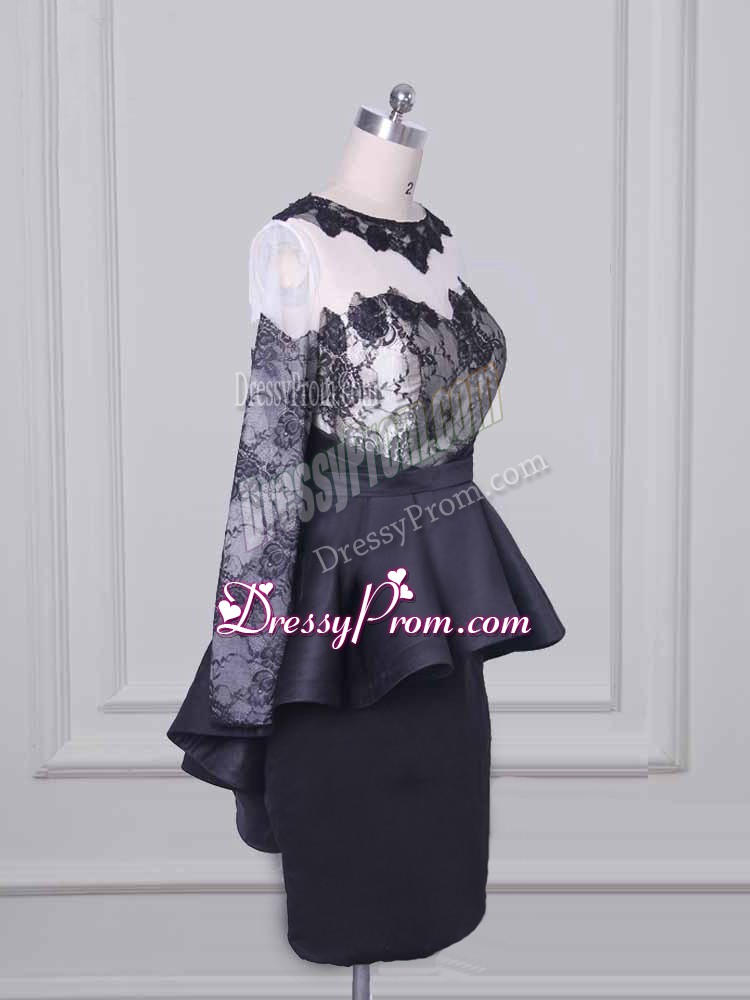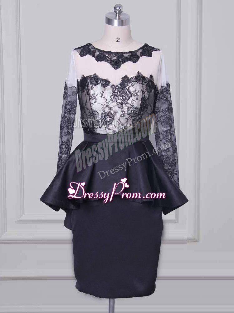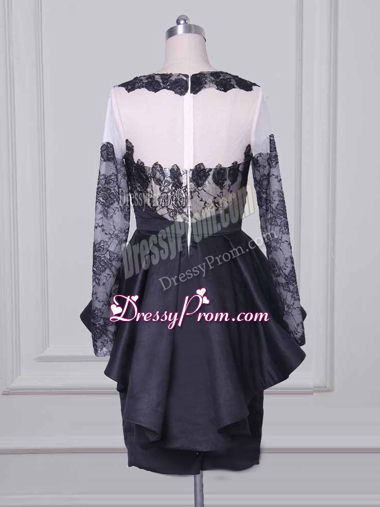 Neckline : ScoopShown Color : BlackSilhouette : Column/SheathSleeve Length : long sleevesHemline : mini lengthBack Detail : ZipperFabric : SatinEmbellishment : Lace,AppliquesOccasion : Prom,PartySeason : Spring,Summer,Fall