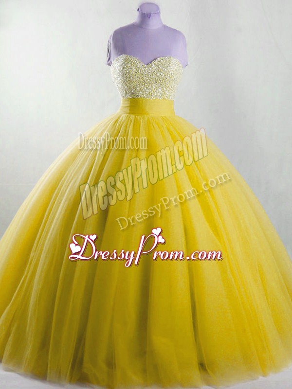 Neckline : StraplessShown Color : YellowSilhouette : Ball GownsSleeve Length : sleevelessHemline : floor lengthBack Detail : Lace upFabric : TulleEmbellishment : BeadingOccasion : Sweet 16,QuinceaneraSeason : Spring,Summer,Fall,Winter