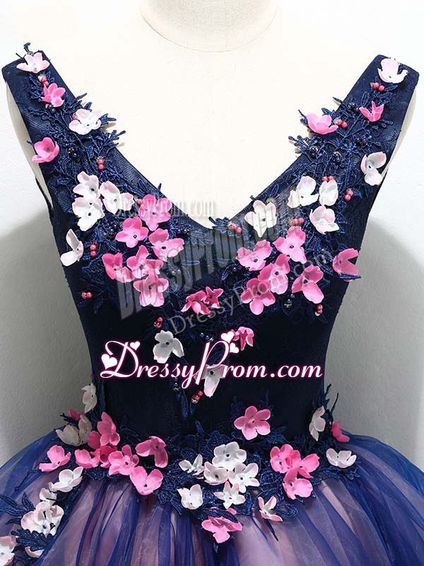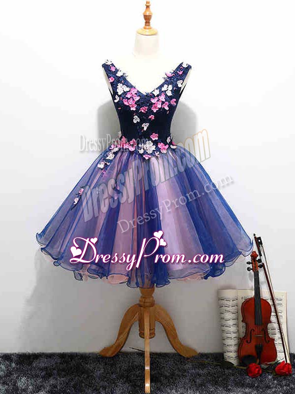 Neckline : V-neckShown Color : Multi-colorSilhouette : A-lineSleeve Length : sleevelessHemline : mini lengthBack Detail : Lace upFabric : OrganzaEmbellishment : Lace,Appliques,Hand Made FlowerOccasion : Prom,Party,Military BallSeason : Spring,Summer,Fall,Winter
