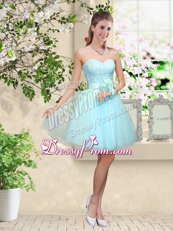 Neckline : SweetheartShown Color : Aqua BlueSilhouette : A-lineSleeve Length : sleevelessHemline : knee lengthBack Detail : Lace upFabric : TulleEmbellishment : Lace,BeltOccasion : Prom,PartySeason : Spring,Summer,Fall