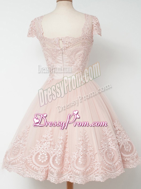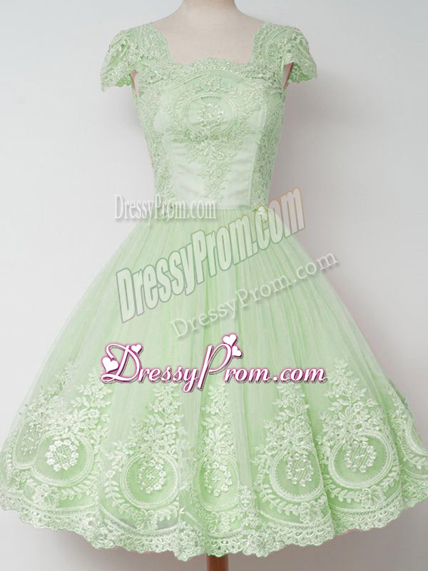 Neckline : SquareShown Color : Spring GreenSilhouette : A-lineSleeve Length : cap sleevesHemline : knee lengthBack Detail : ZipperFabric : TulleEmbellishment : LaceOccasion : Prom,Party,Wedding PartySeason : Spring,Summer,Fall,Winter