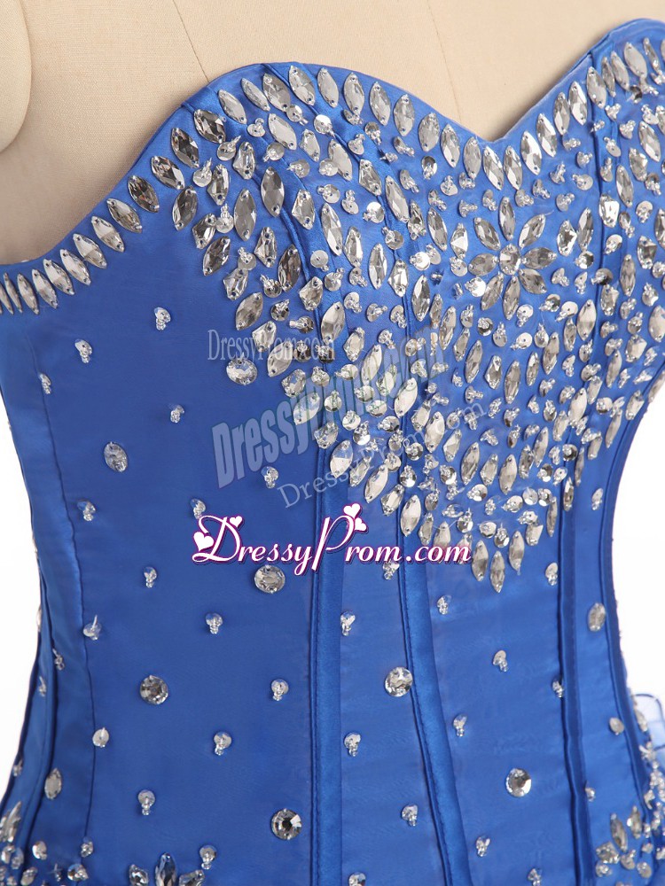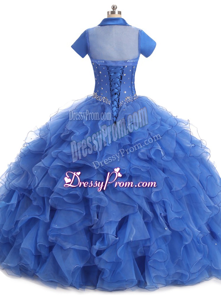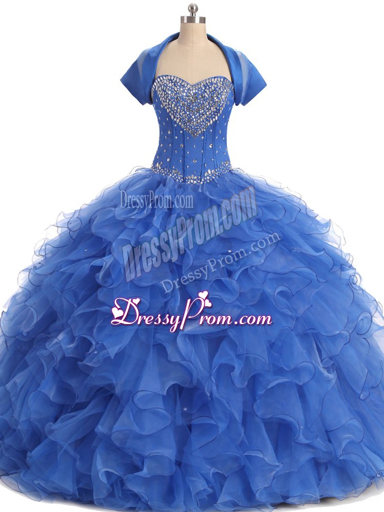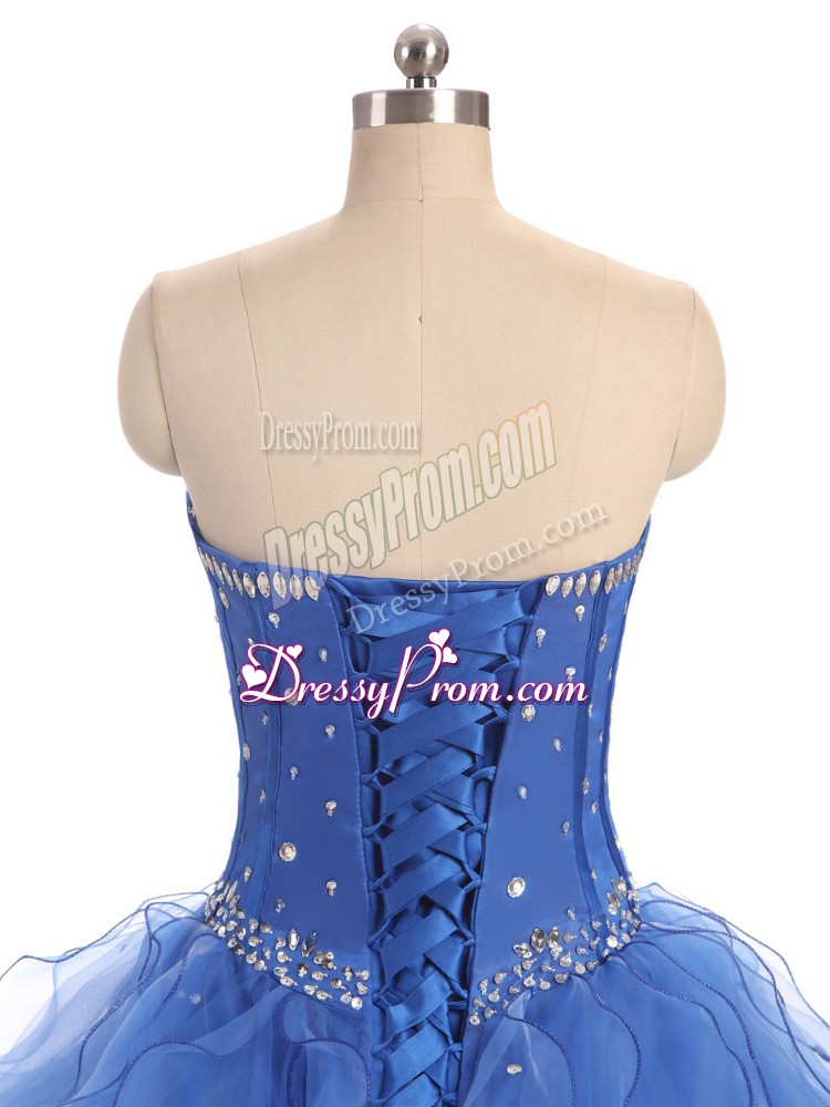 Neckline : StraplessShown Color : BlueSilhouette : Ball GownsSleeve Length : sleevelessHemline : floor lengthBack Detail : Lace upFabric : OrganzaEmbellishment : Beading,RufflesOccasion : Sweet 16,QuinceaneraSeason : Spring,Summer,Fall,Winter