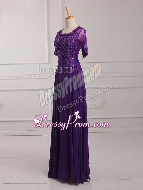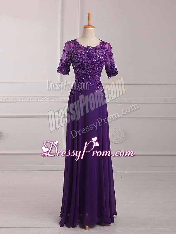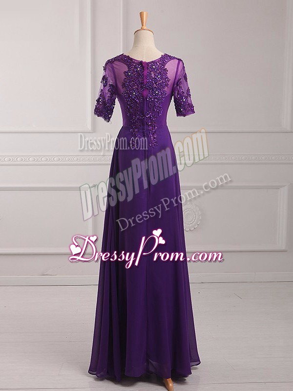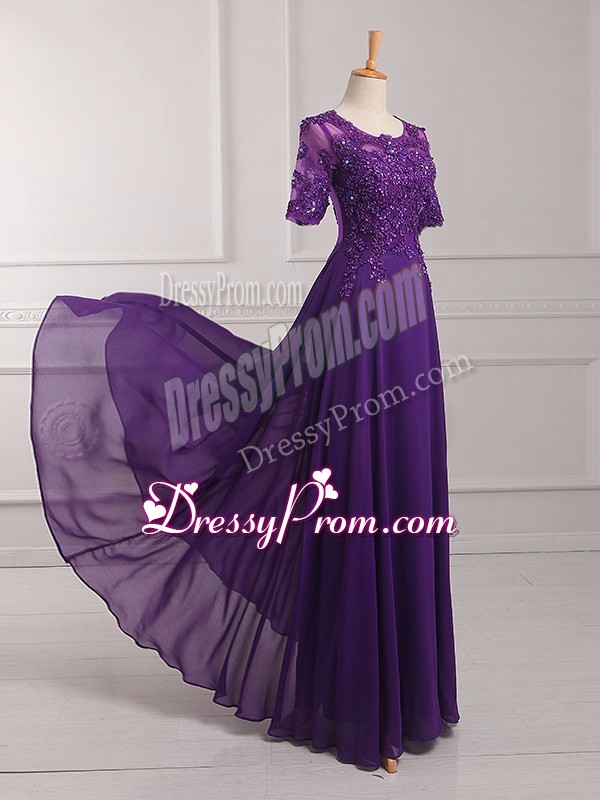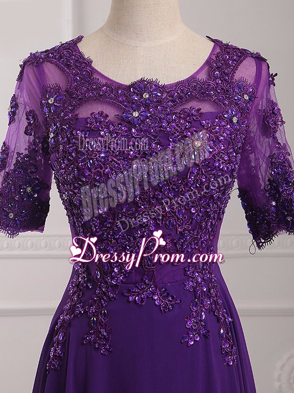 Neckline : ScoopShown Color : PurpleSilhouette : EmpireSleeve Length : half sleevesHemline : floor lengthBack Detail : ZipperFabric : ChiffonEmbellishment : Lace,AppliquesOccasion : Prom,Military BallSeason : Spring,Summer,Fall,Winter
